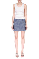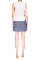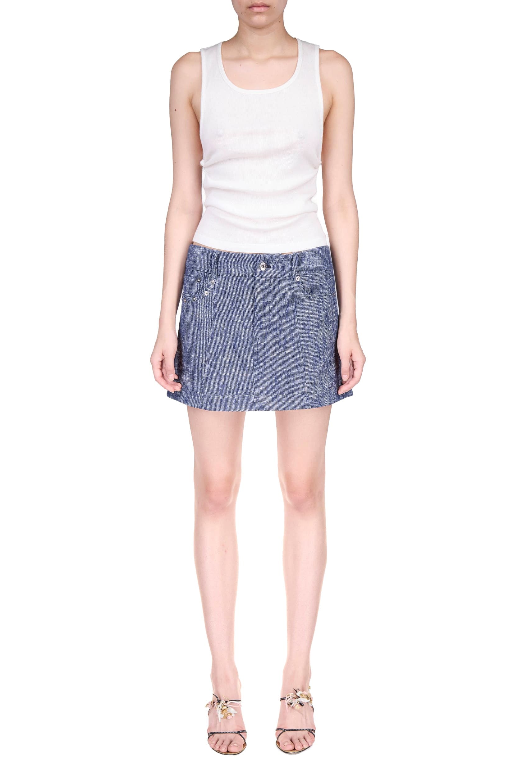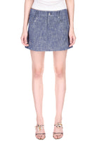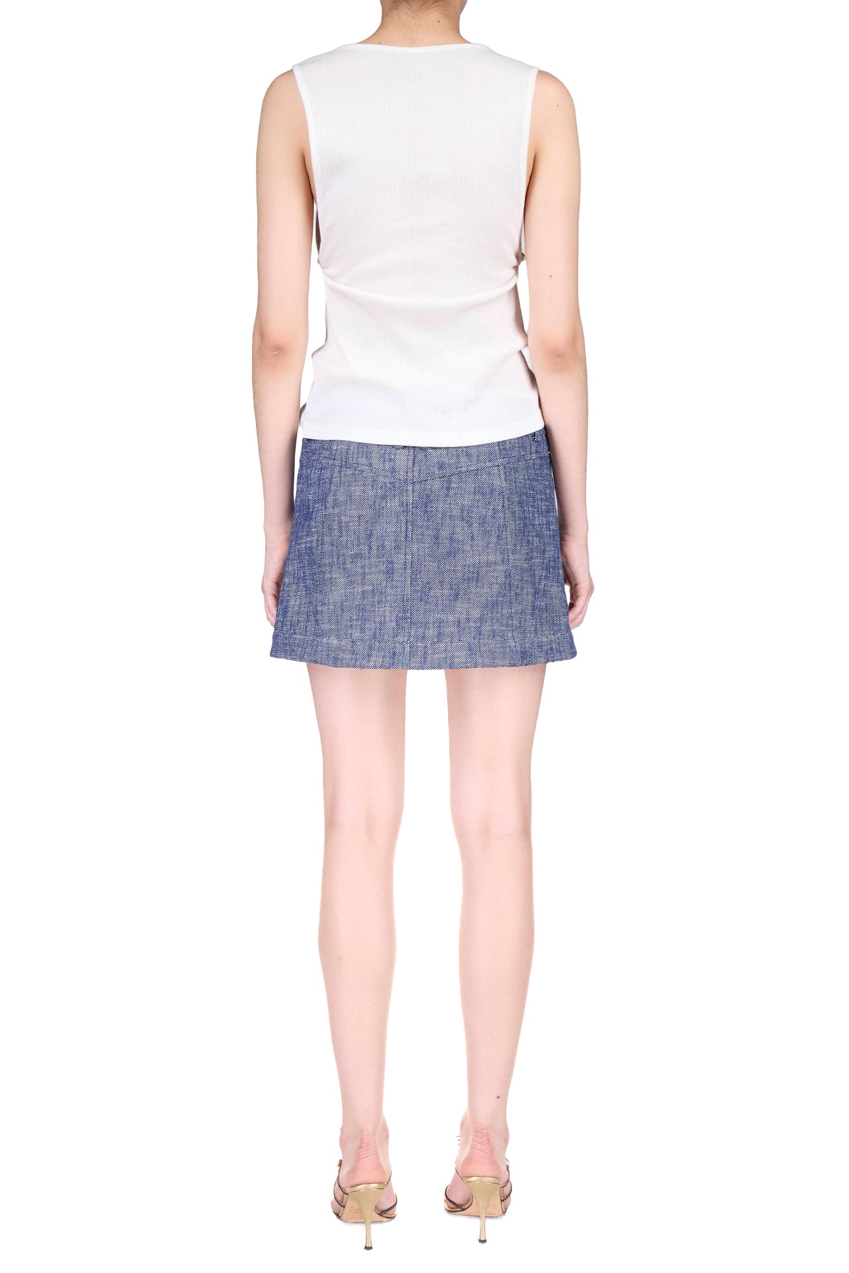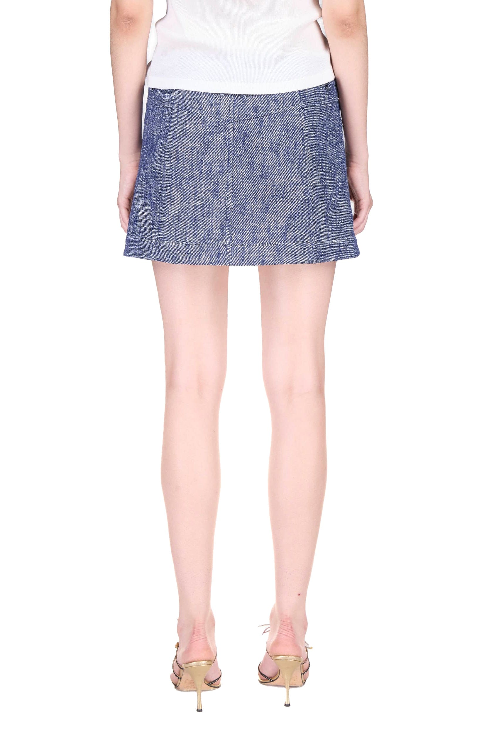 Crafted of woven malfilé suiting, PRISCAVera’s new miniskirt features the characteristics that typically define denim: detailed pockets, a custom logo-engraved button and rivets. Cut with a slight A-line, it features seaming for shape.