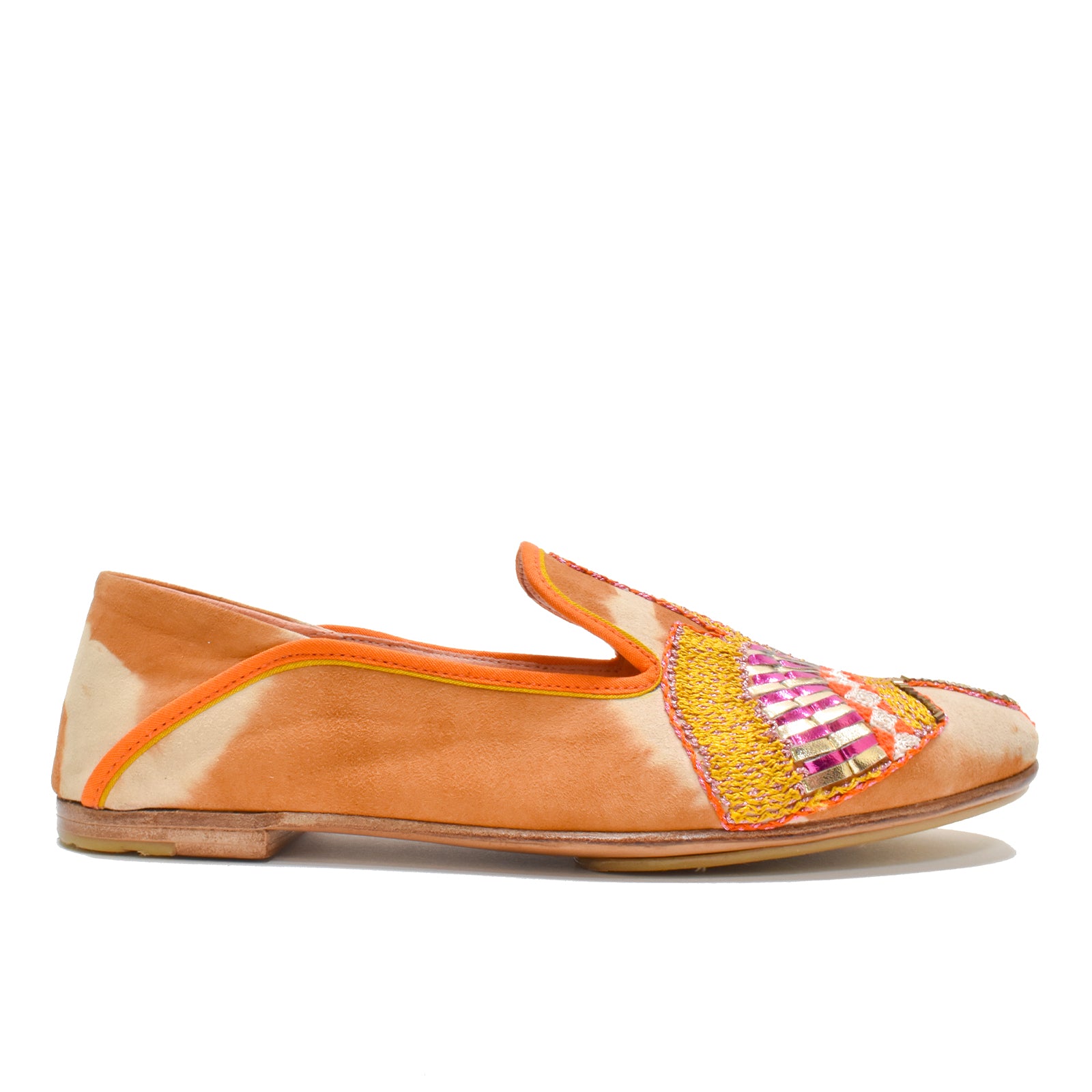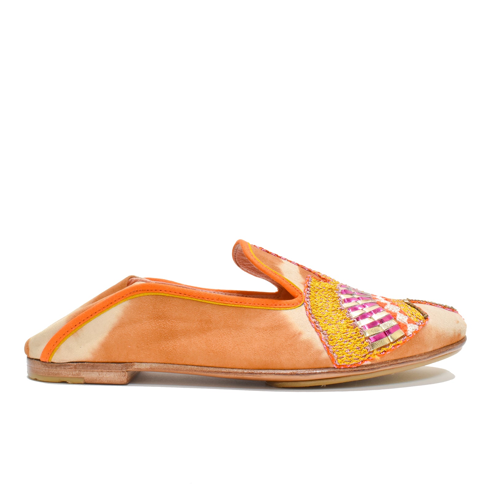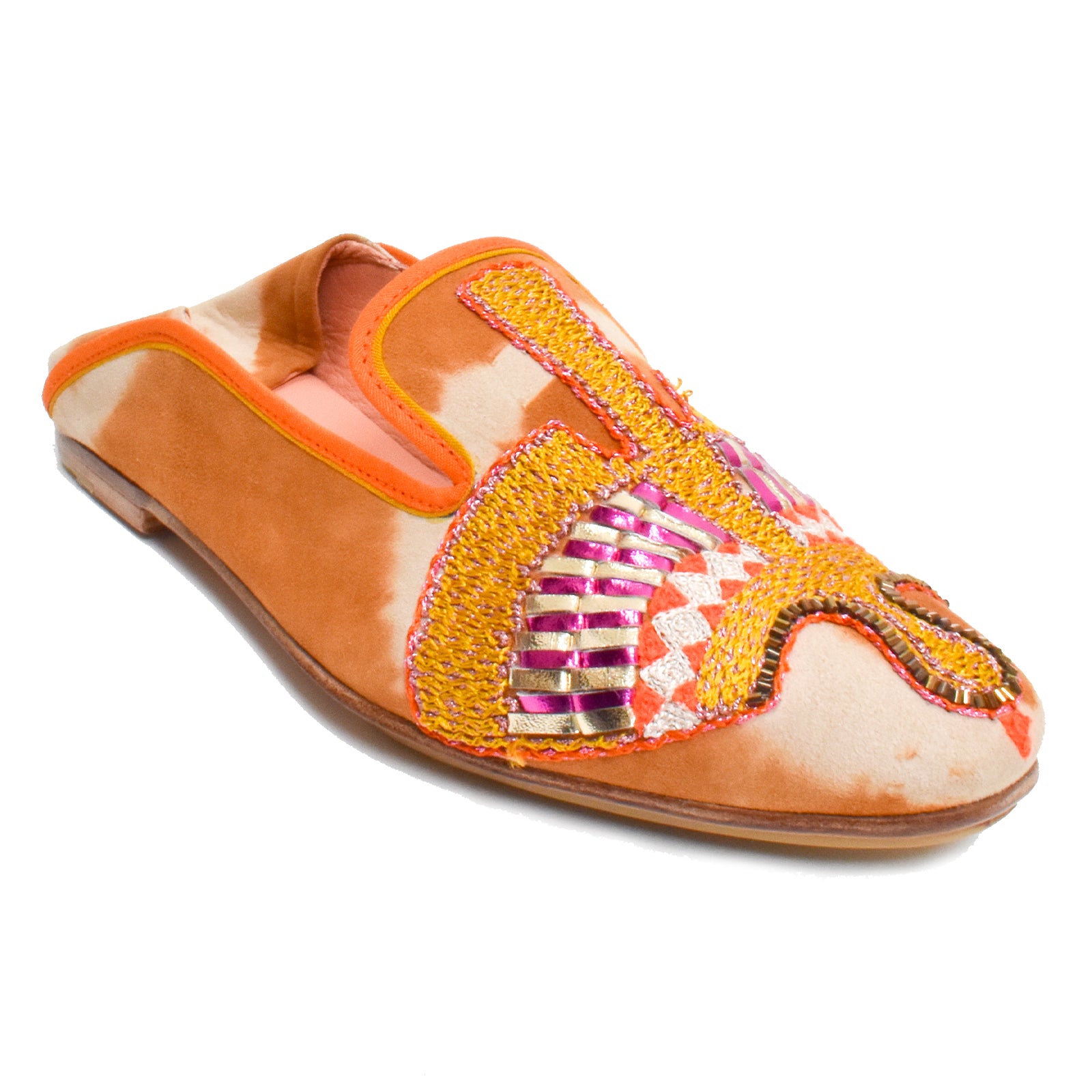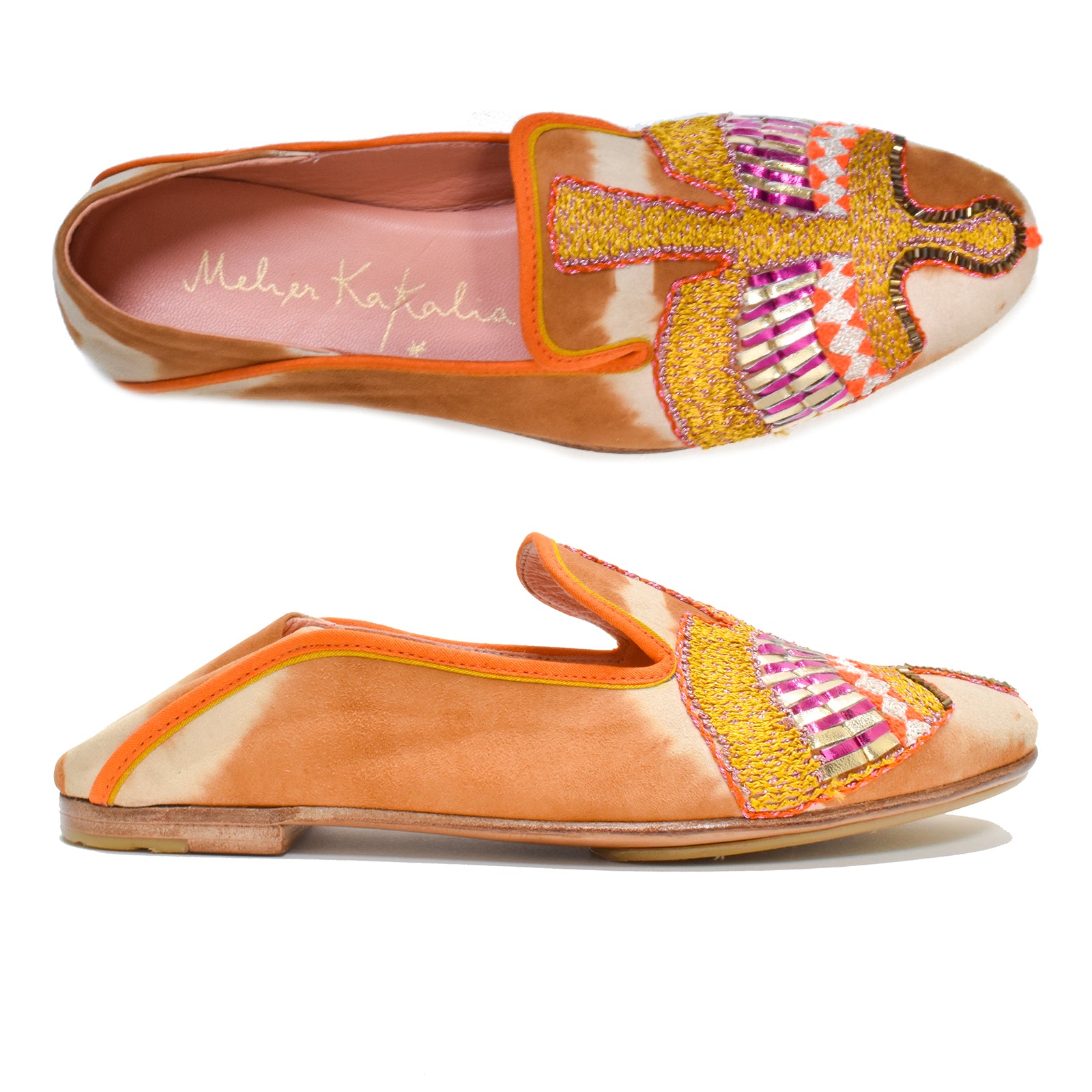 ANZU moccasin is hand embroidered on tie and dye leather using sustainable methods. Due to the nature of Tie Dye, each foot has unique markings, which are a feature of the product. Embroidered by a tribe living along the Silk Route, these nomadic artisans have passed down their embroidery techniques for generations. The embroidery is rich, full of texture, and durable, as it is embroidered directly into the leather. Wear them as a moccasin or flip the back to create a babouche-style shoe.