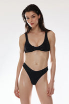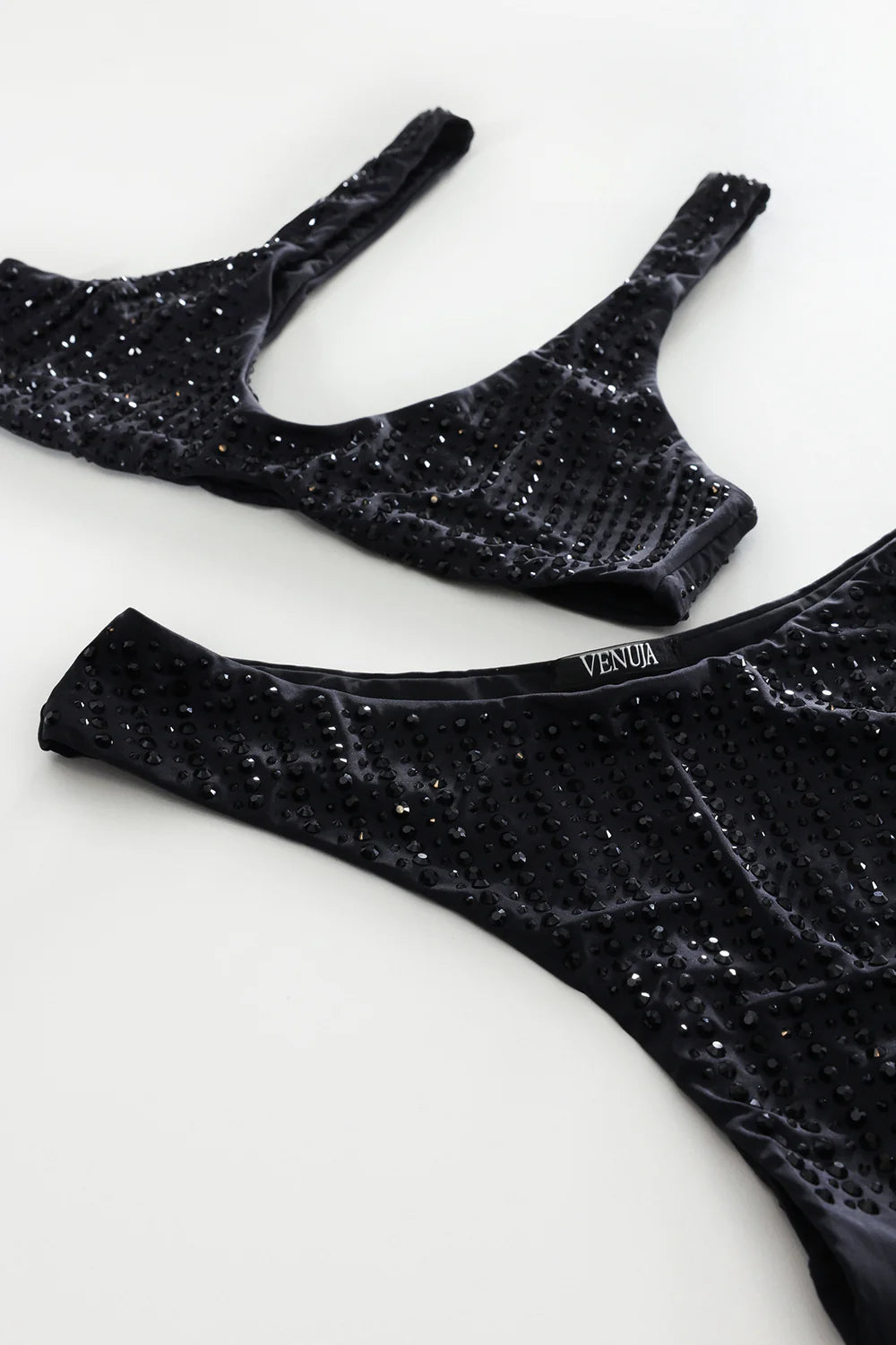 Crafted from premium microfiber with soft finish and pinstripe rhinestones embellishments. This set features a sporty cut brassiere with an ultra soft lining for comfort and the shape provides the right amount of support. The brazilian is designed to be worn high cut. The sporty silhouette is elevated with feminine touches becoming the sun kissed perfect set. Available in a range of sizes to suit every body.
