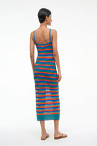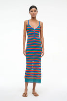 Delmare is an easy knit daydress featuring a sheer striped pattern. This style has a v-neckline, front button detailing, and spaghetti straps.