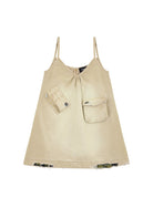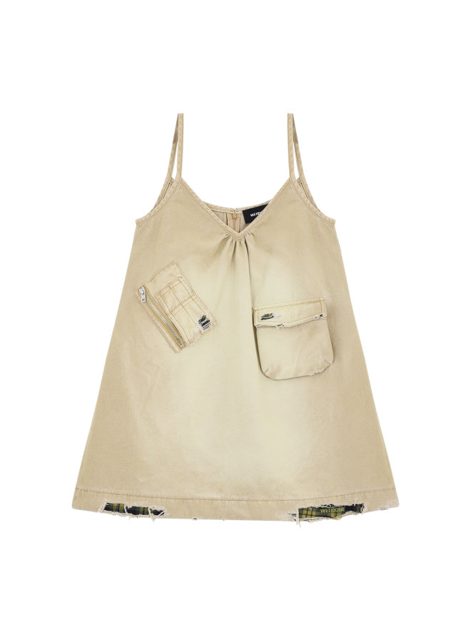 This beige pocket mini dress combines casual utility with effortless charm, featuring a flattering V-neck, spaghetti straps, and both flap and utility pockets on the front. With a gathered neckline, faded wash, and a distressed hem, it offers a laid-back, worn-in vibe perfect for everyday cool. Finished with a zip closure at the back for easy wear.