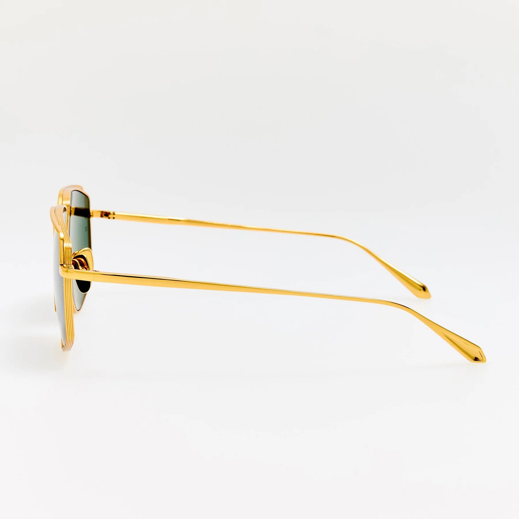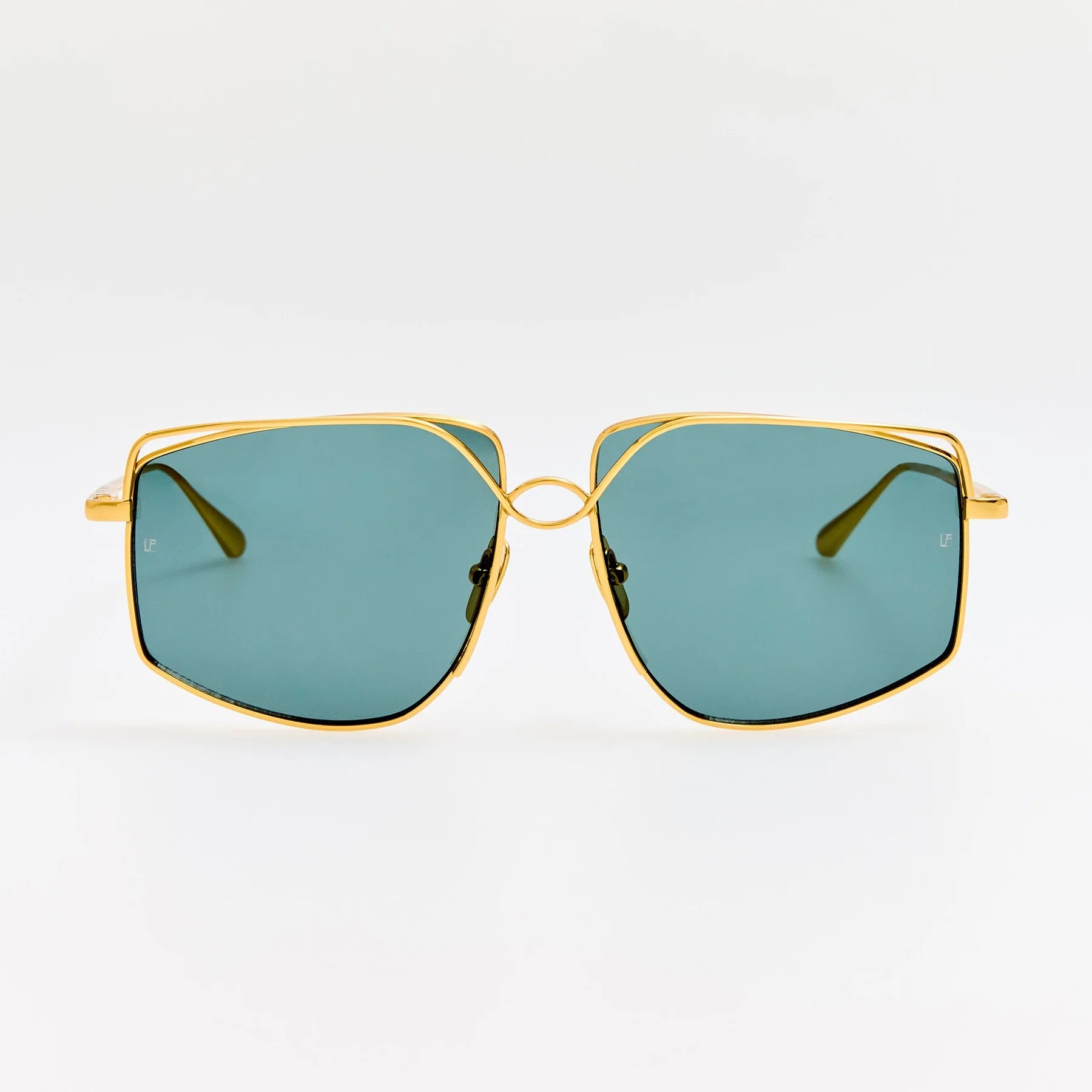 The Miranda oversized frame is crafted from 22k gold plated pure Japanese titanium and fitted with deep green lenses offering full UV protection. The nose bridge features a unique, subtle twist design, adding an artistic touch. The frame is fitted with adjustable titanium nose pads that offer a tailored fit by allowing bespoke positioning for enhanced comfort.