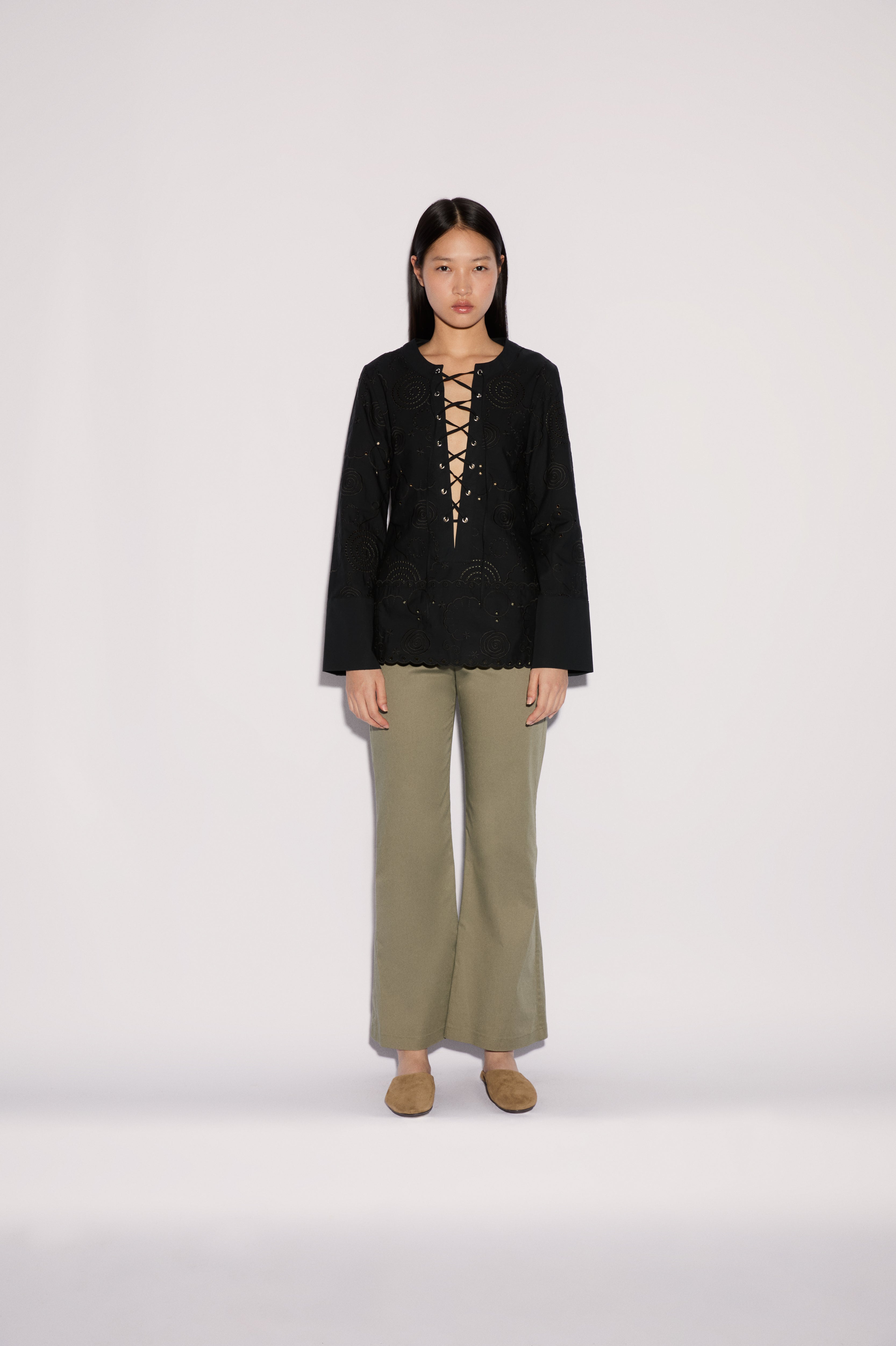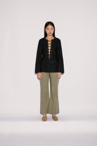 Cut from fluid, olive green fabric, ANIM's Sage Pants exude effortless sophistication with their relaxed, wide-leg silhouette. A high-rise waist and subtle pleating enhance their tailored feel, making them a versatile staple from desk to dinner.