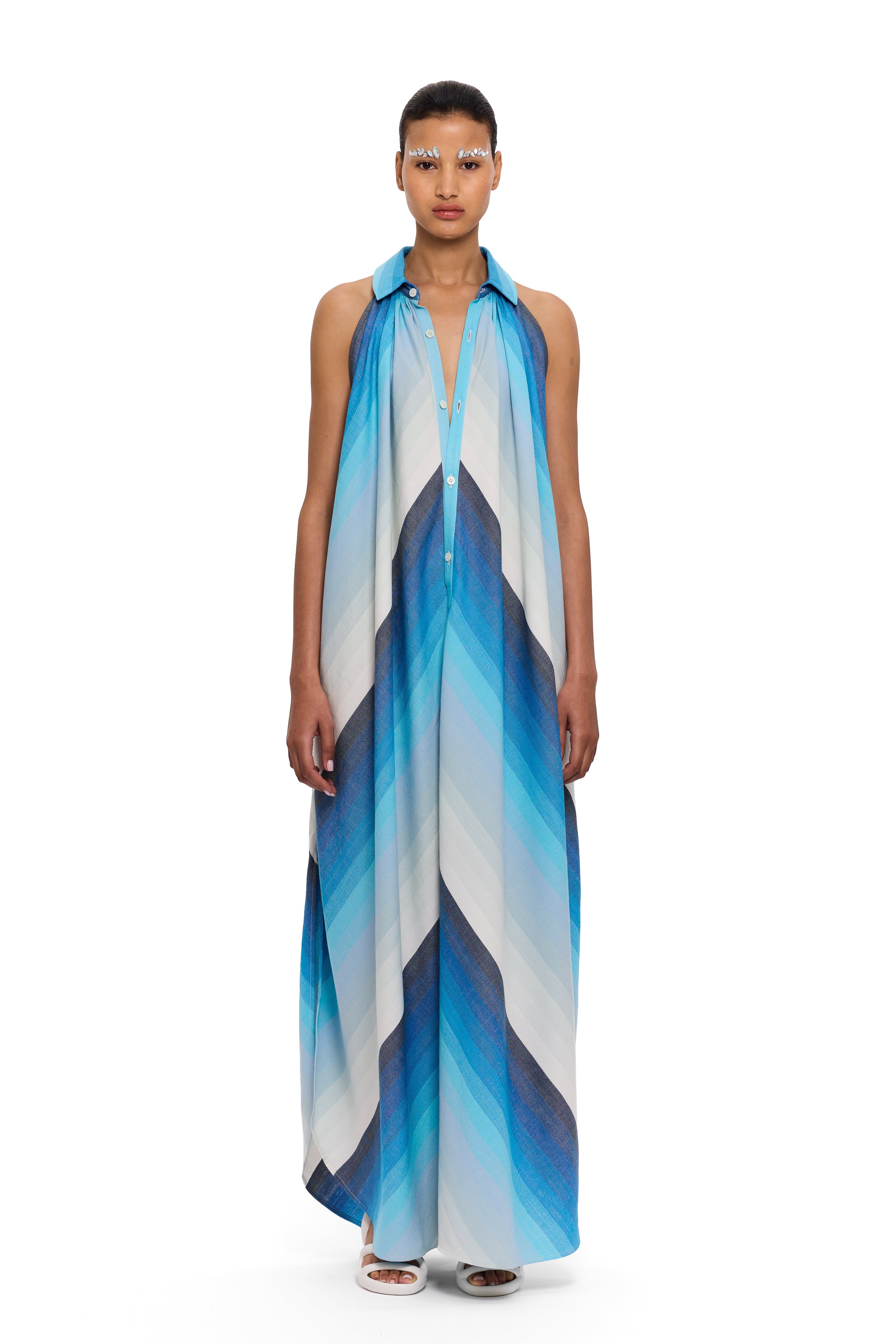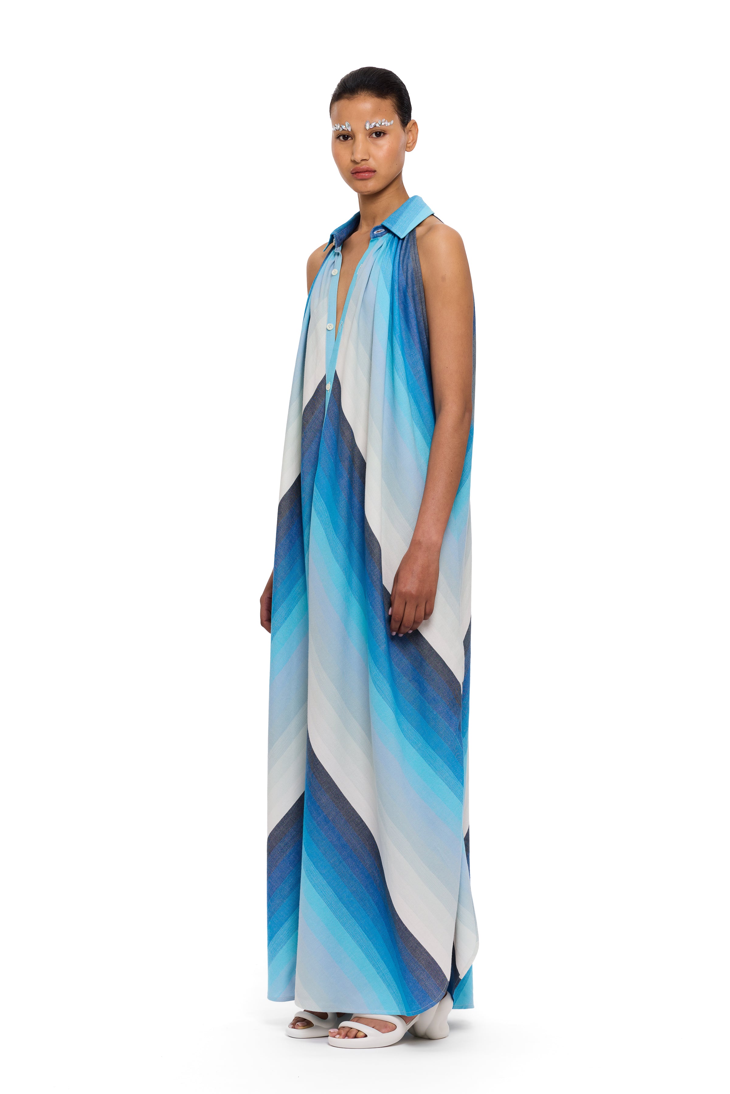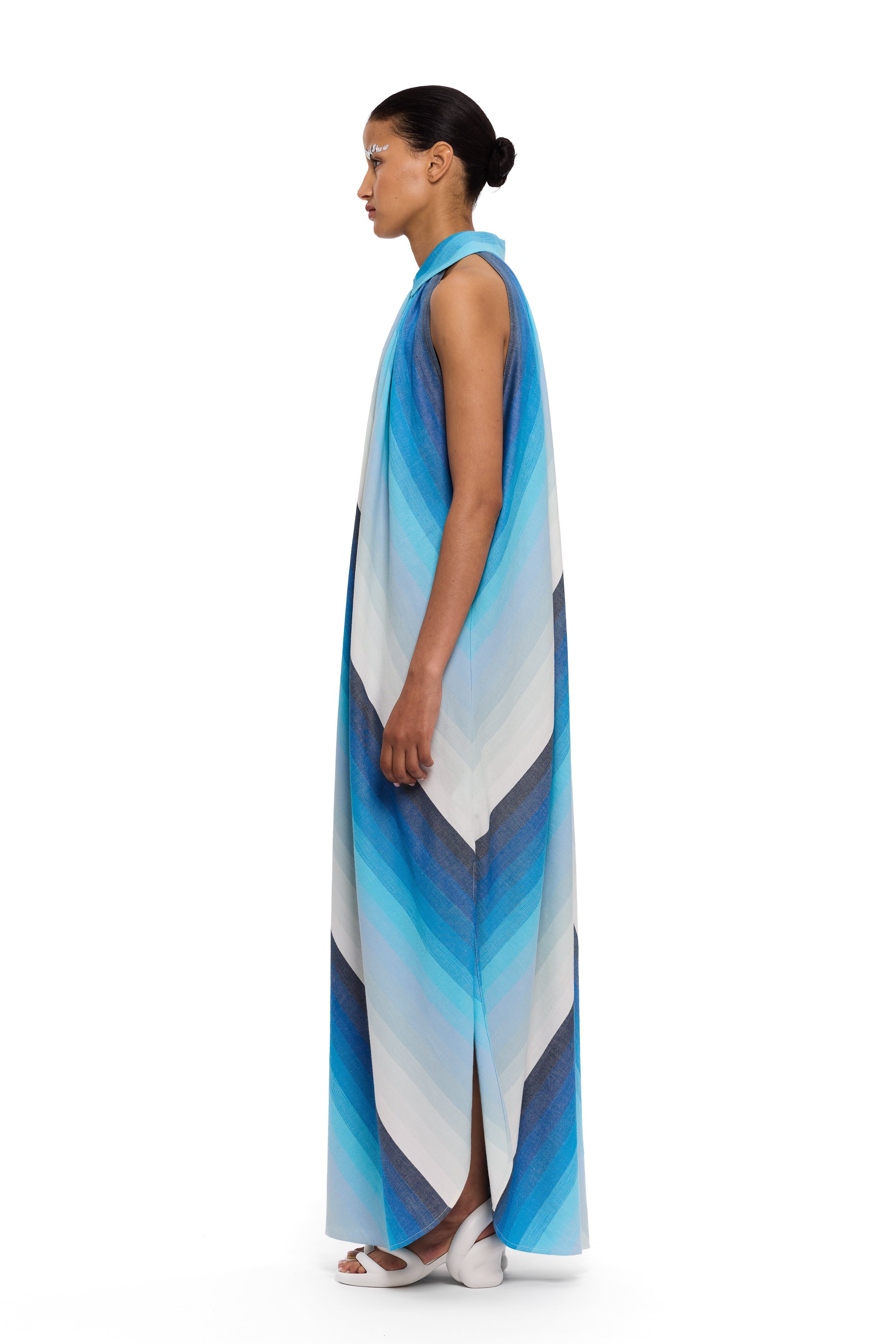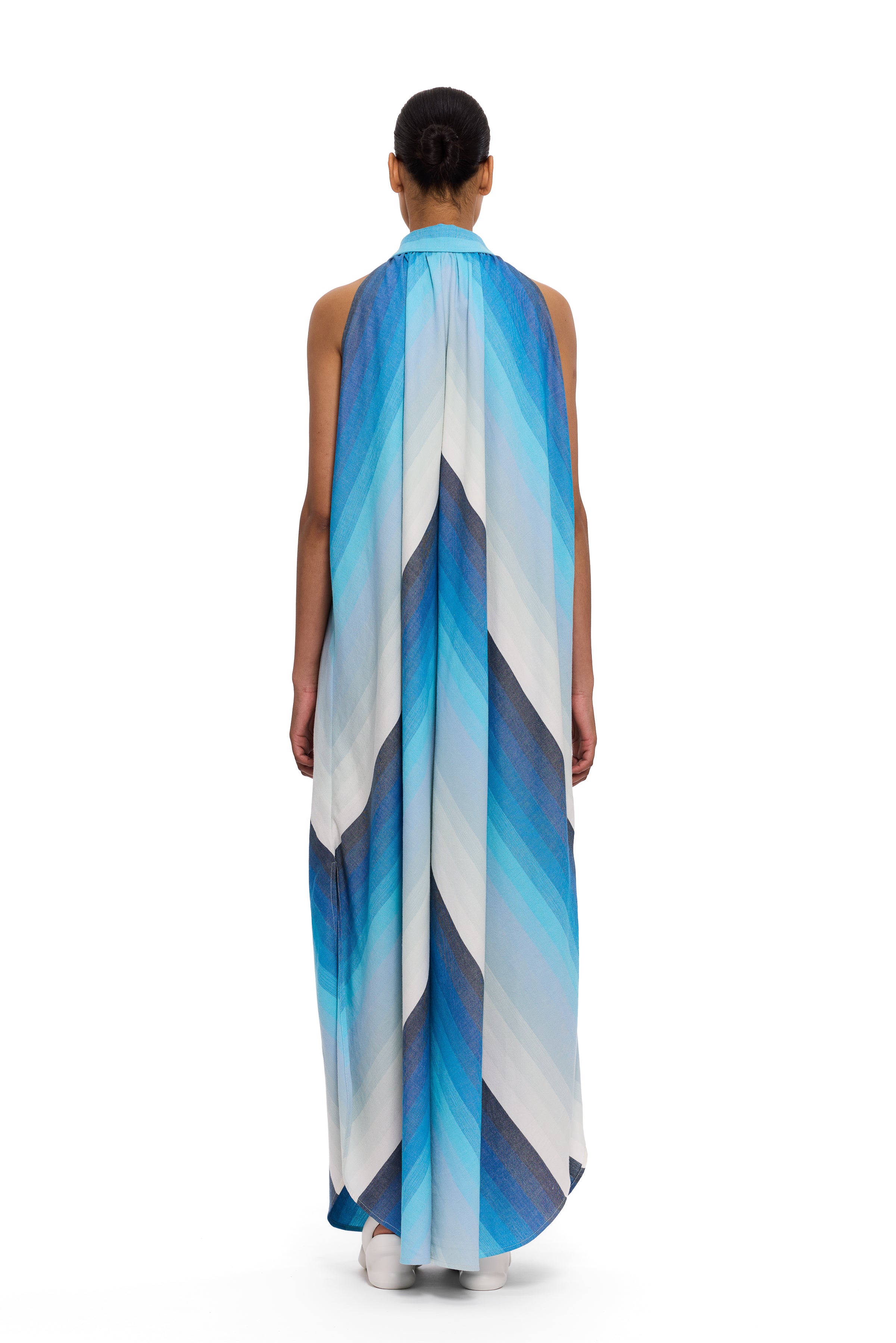 The halter dress is a relaxed and effortless silhouette, handwoven from high-quality cotton yarns, providing a distinguished element of craftsmanship. This fabric is handwoven in their lightest thread count—defined by translucency, subtle structure, and fluid ease. This style features a V-neckline and side seam slits.