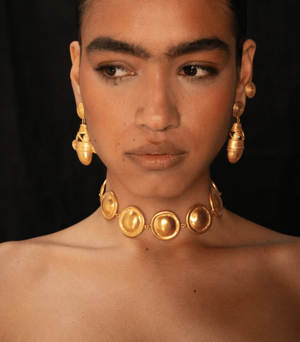 Inspired by Tayrona culture. A bold choker with golden spheres that echo the strength and visual richness of TAYRONA ceremonial offerings.