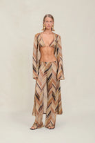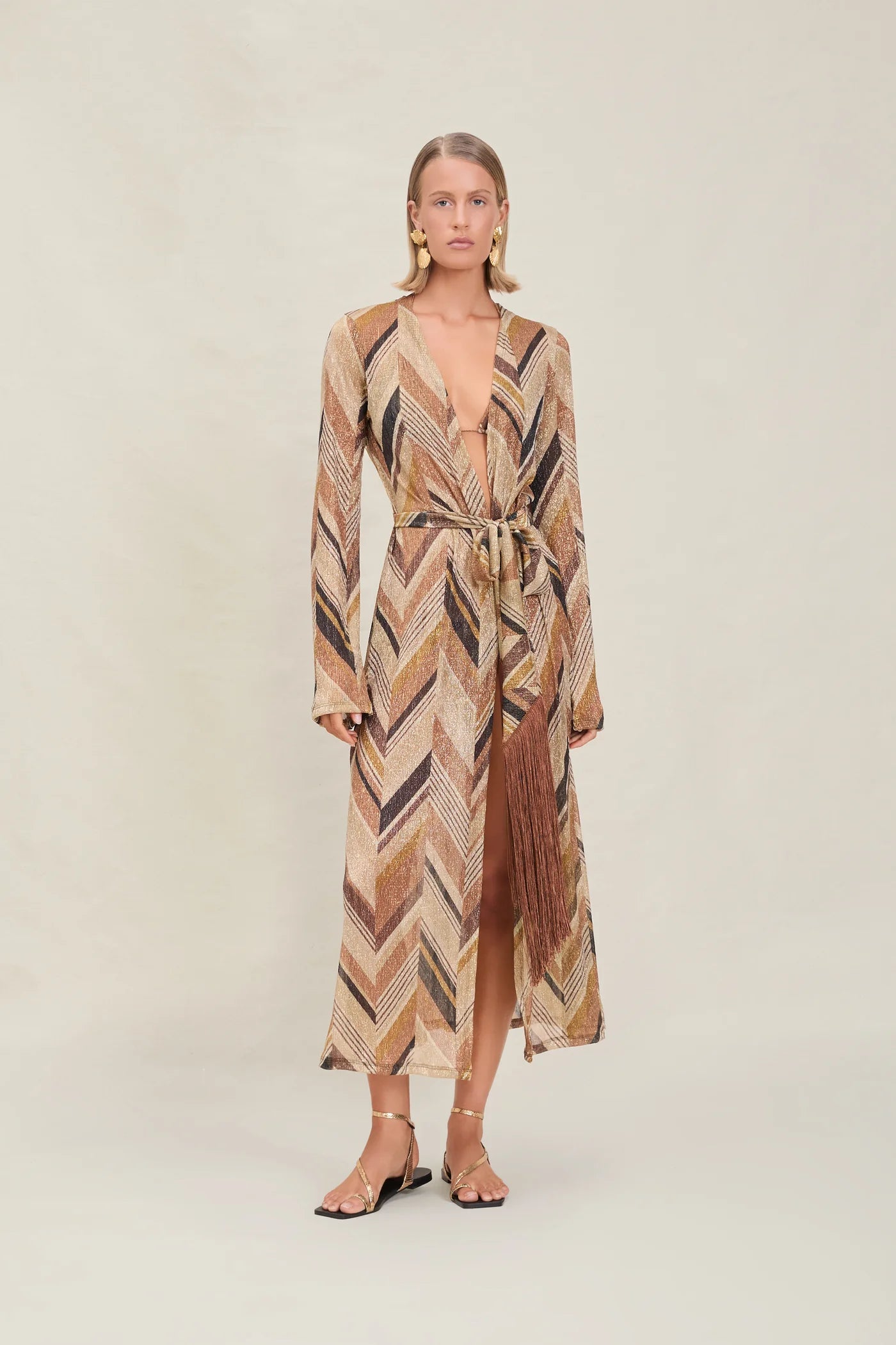 The Odessa is a flowy, maxi robe with bell sleeves, and an adjustable tie belt with fringe detailing. Pairs back to the Ollie Pant.
