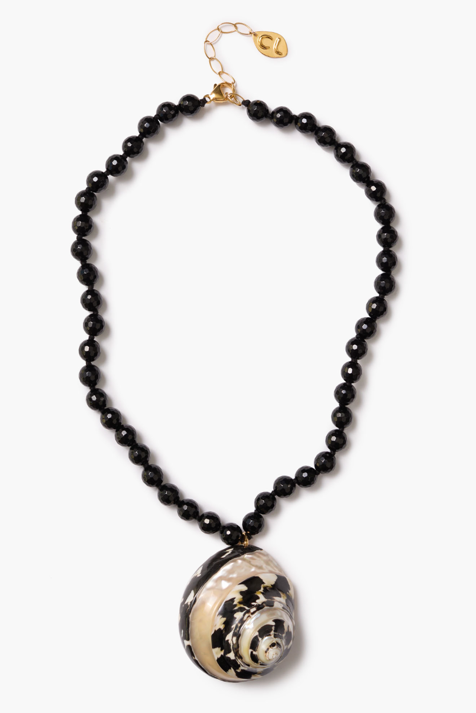 18K gold plated sterling silver necklace featuring magpie banded shell pendant on onyx. 17 - 19in. length. Adjustable.