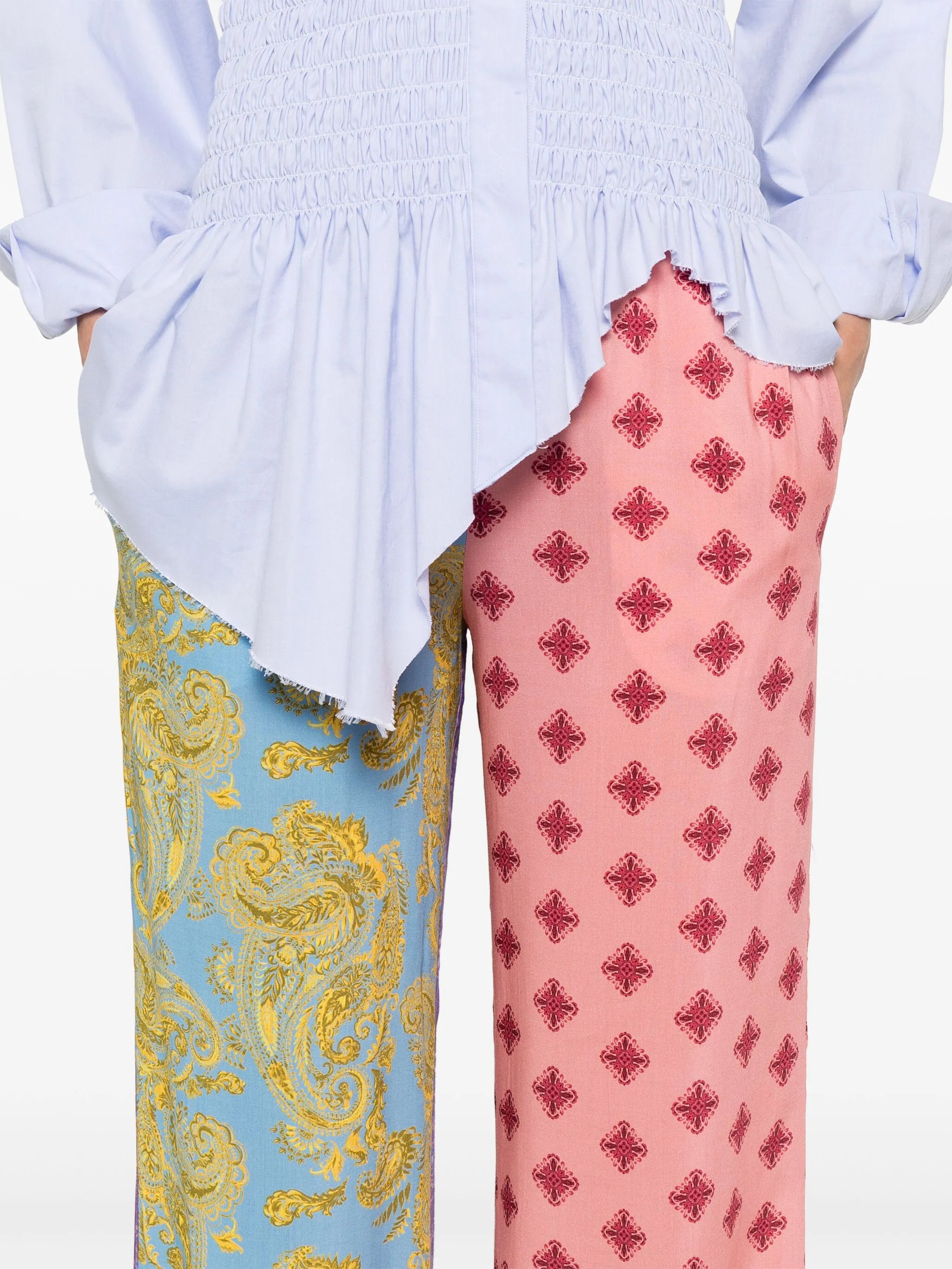 A bold fusion of color and print, these silk drawstring pants reimagine classic paisley through a contemporary, eclectic lens. Each leg features a contrasting motif—one side in soft pink with geometric florals, the other in sky blue and gold paisley—creating a dynamic visual rhythm that captures Donde Esteban’s playful spirit. Effortlessly relaxed yet statement-making, they’re perfect for art openings, coastal evenings, or casual city strolls. Style them with a crisp white tee, open shirt, or tank to let the print take center stage.