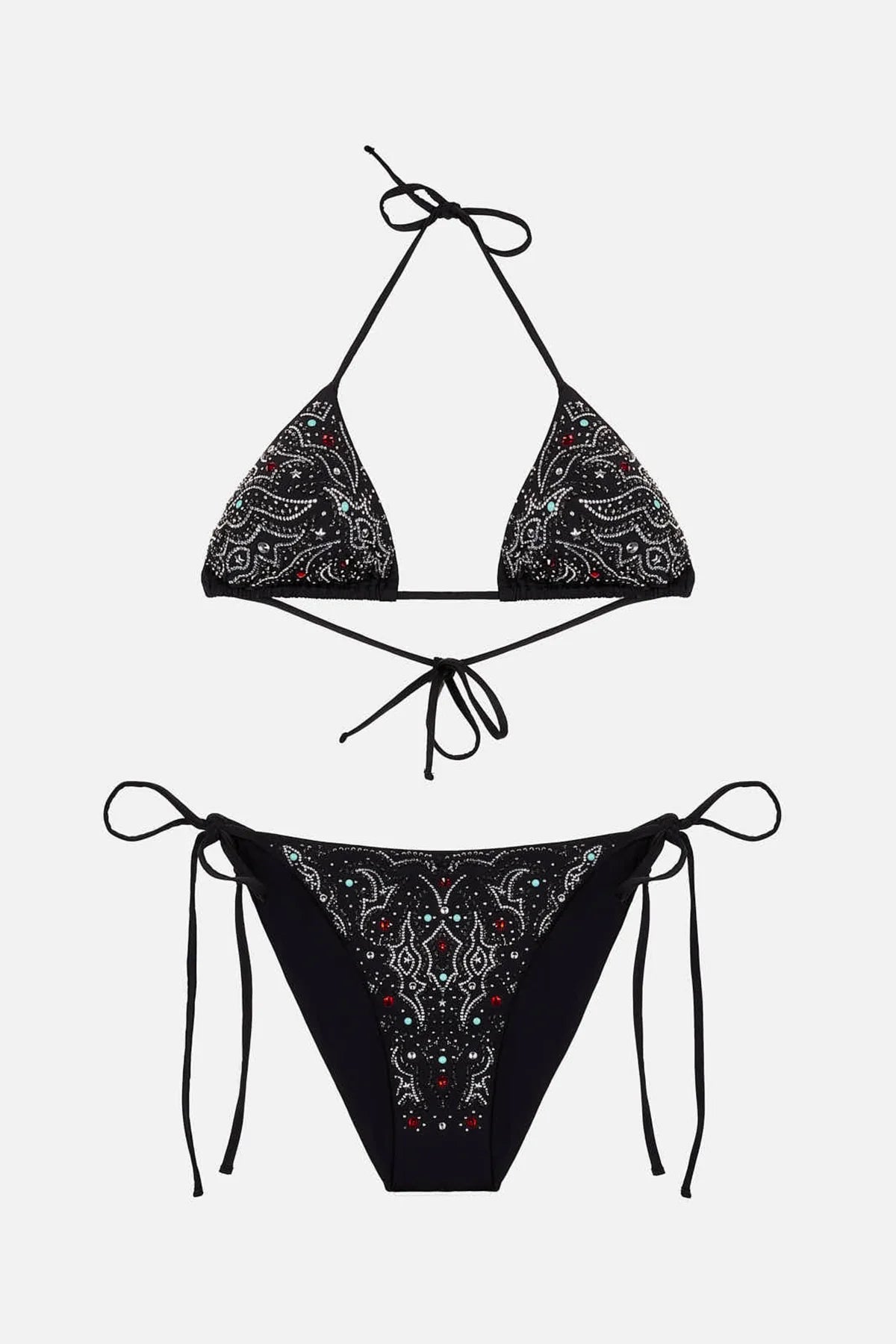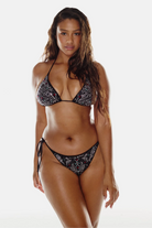 Crafted from premium microfiber with soft finish and texan inspired embellishments. This set features a classic adjustable triangle top with removable cups that offers adjustable back and neck straps for a personalized fit with an ultra soft lining for comfort and an adjustable self tie slip bottom that provides just the right amount of coverage. Perfect lounging by the pool or strolling along the city streets this bikini set reveals an unmistakable boho vibe making it as a statement piece of your wardrobe. Available in a range sizes to suit every body.