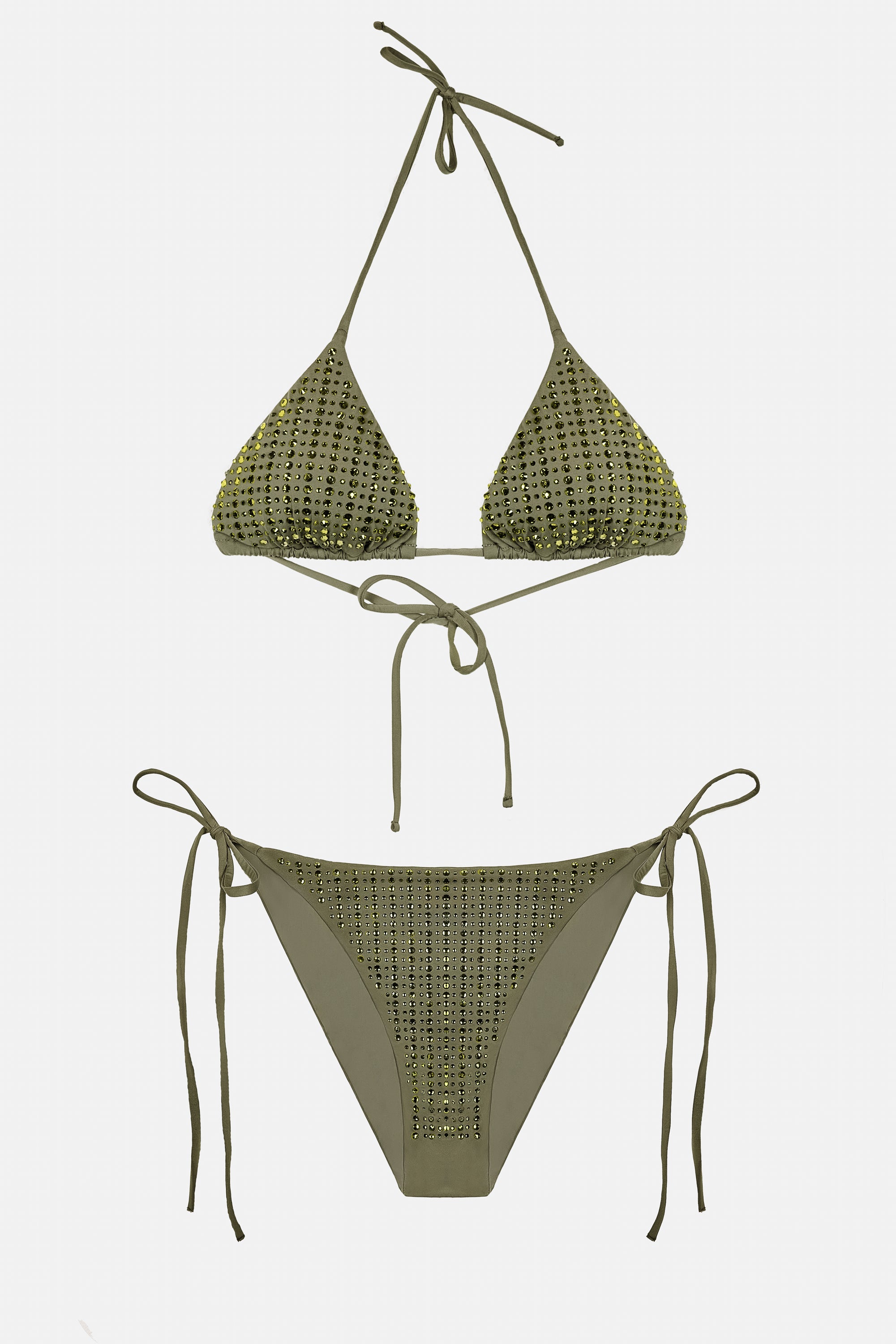 Crafted from premium microfiber with soft finish and pinstripe rhinestones embellishments. This set features a classic adjustable triangle top with removable cups that offers adjustable back and neck straps for a personalized fit with an ultra soft lining for comfort and an adjustable self tie slip bottom that provides just the right amount of coverage. The sporty silhouette is elevated with feminine touches becoming the sun kissed perfect set. Available in a range of sizes to suit every body.