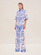 The Davi Pant is a printed design crafted from a cotton-linen blend, paired with the Farad Top.