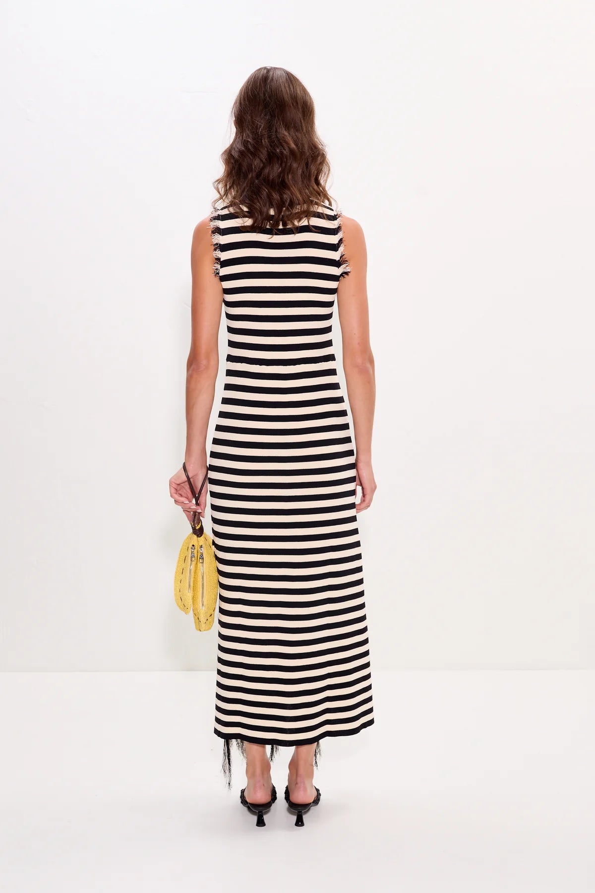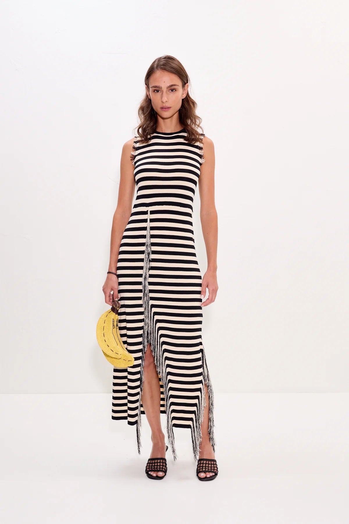 Soft knit midi dress designed with a close, flattering fit through the body. Finished with subtle asymmetrical slits accented by delicate fringe at the slits and armholes for added texture and detail.