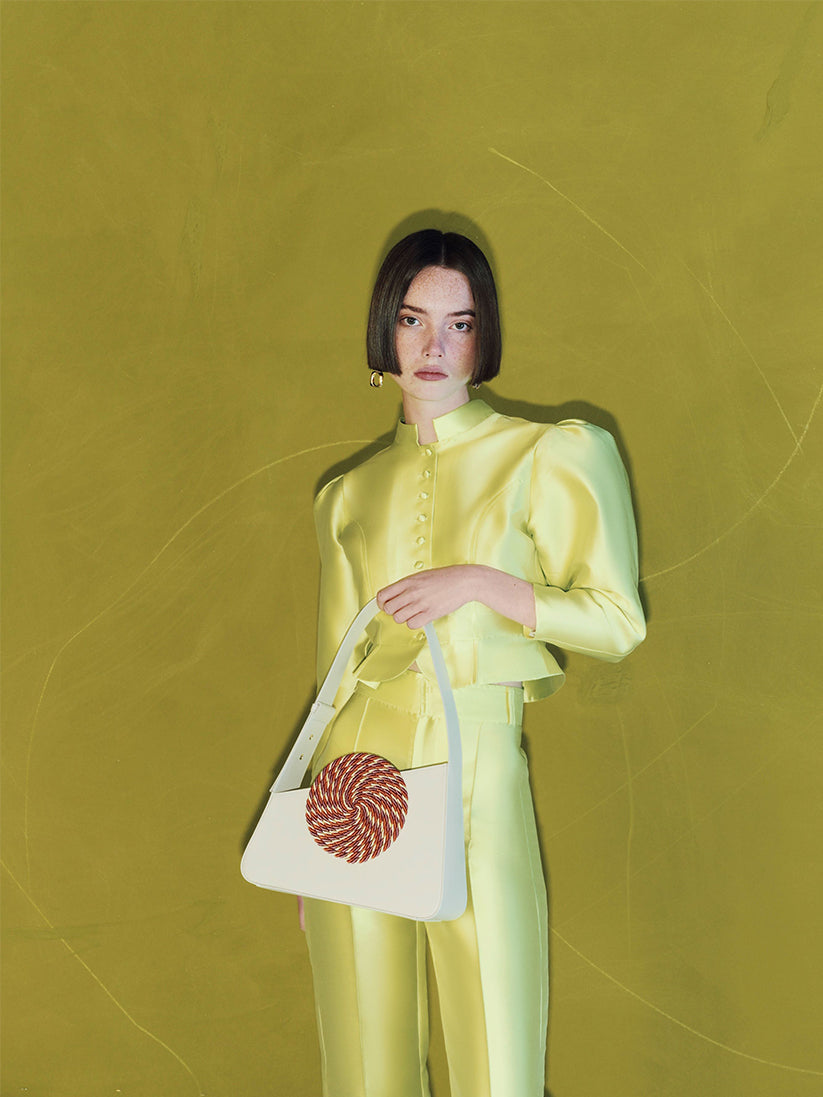The Albert Bag Passementerie is crafted in a soft calf leather, highlighted by its smooth texture and a tone-on-tone passementerie roundel that recalls the geometric inspiration of the range. Passementerie is a French know-how that brings singularity and originality to this iconic baguette bag.