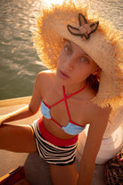 This elegant woven straw hat features a playful crochet detail, adding a pop of color and texture to its natural design. A perfect accessory for sunny days, it combines sophistication with a charming touch.