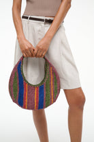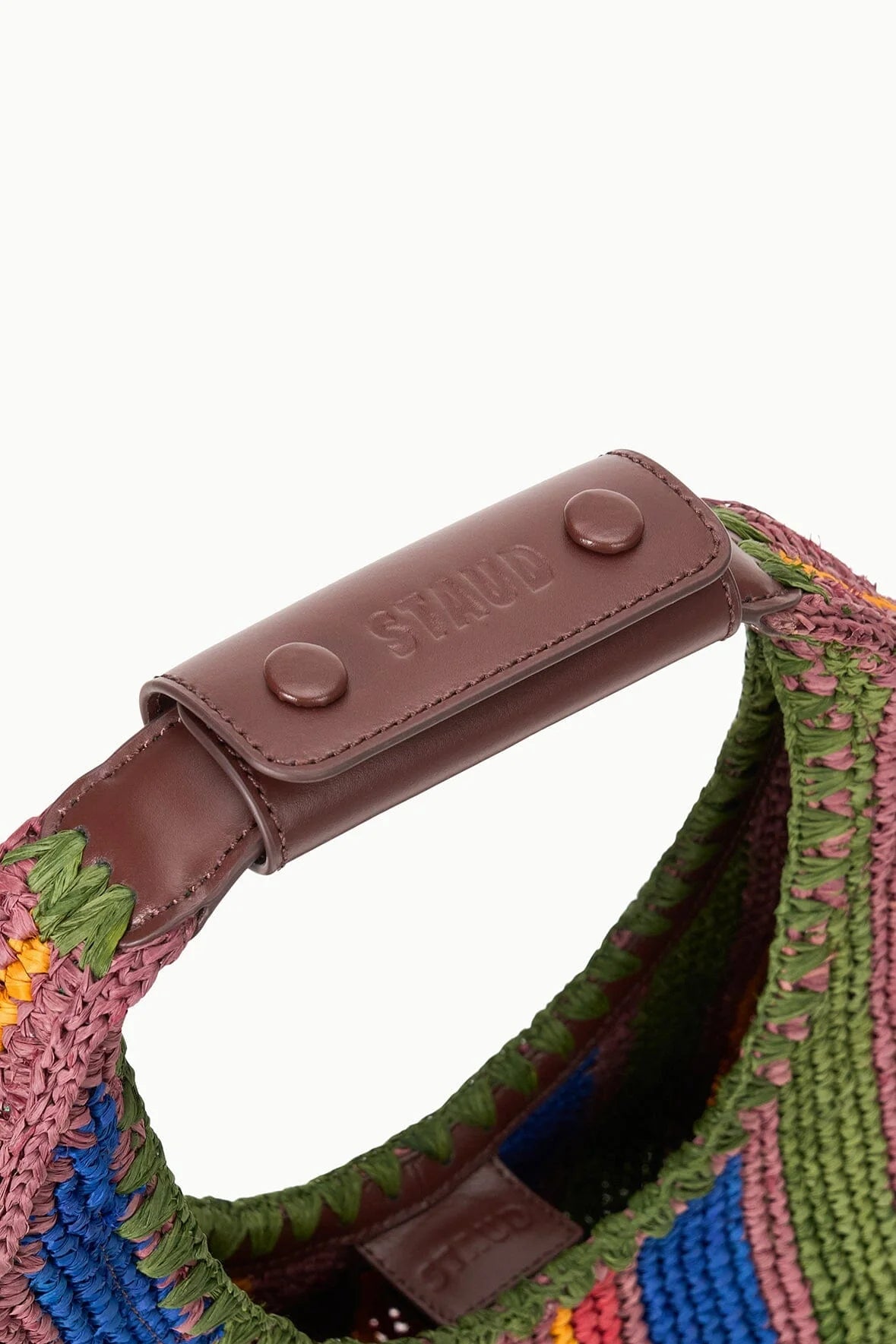 The classic Moon Tote is updated in a seasonal striped raffia. This style features a removable STAUD-embossed handle accent and a magnetic snap closure.