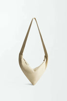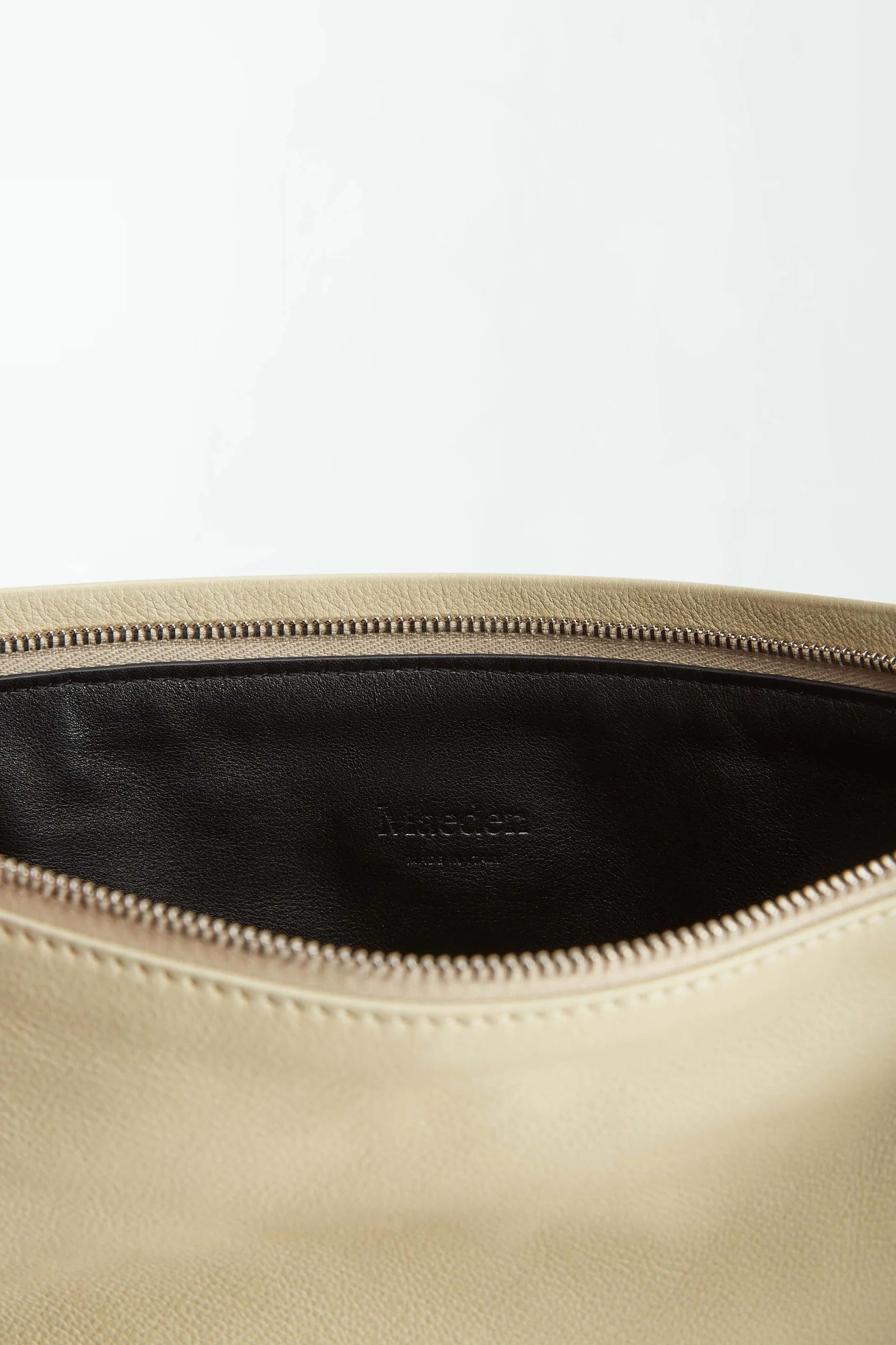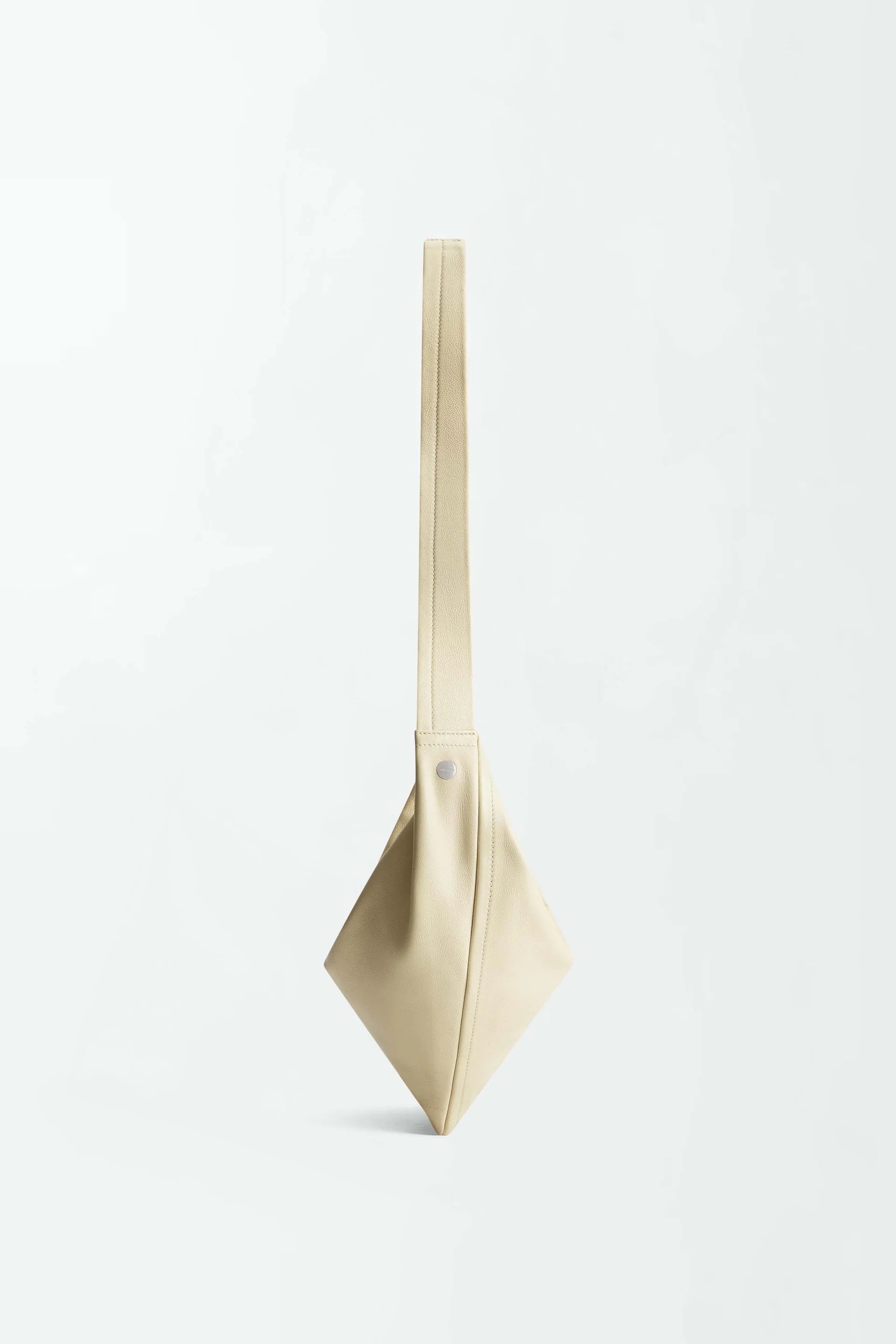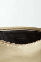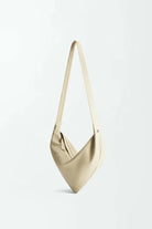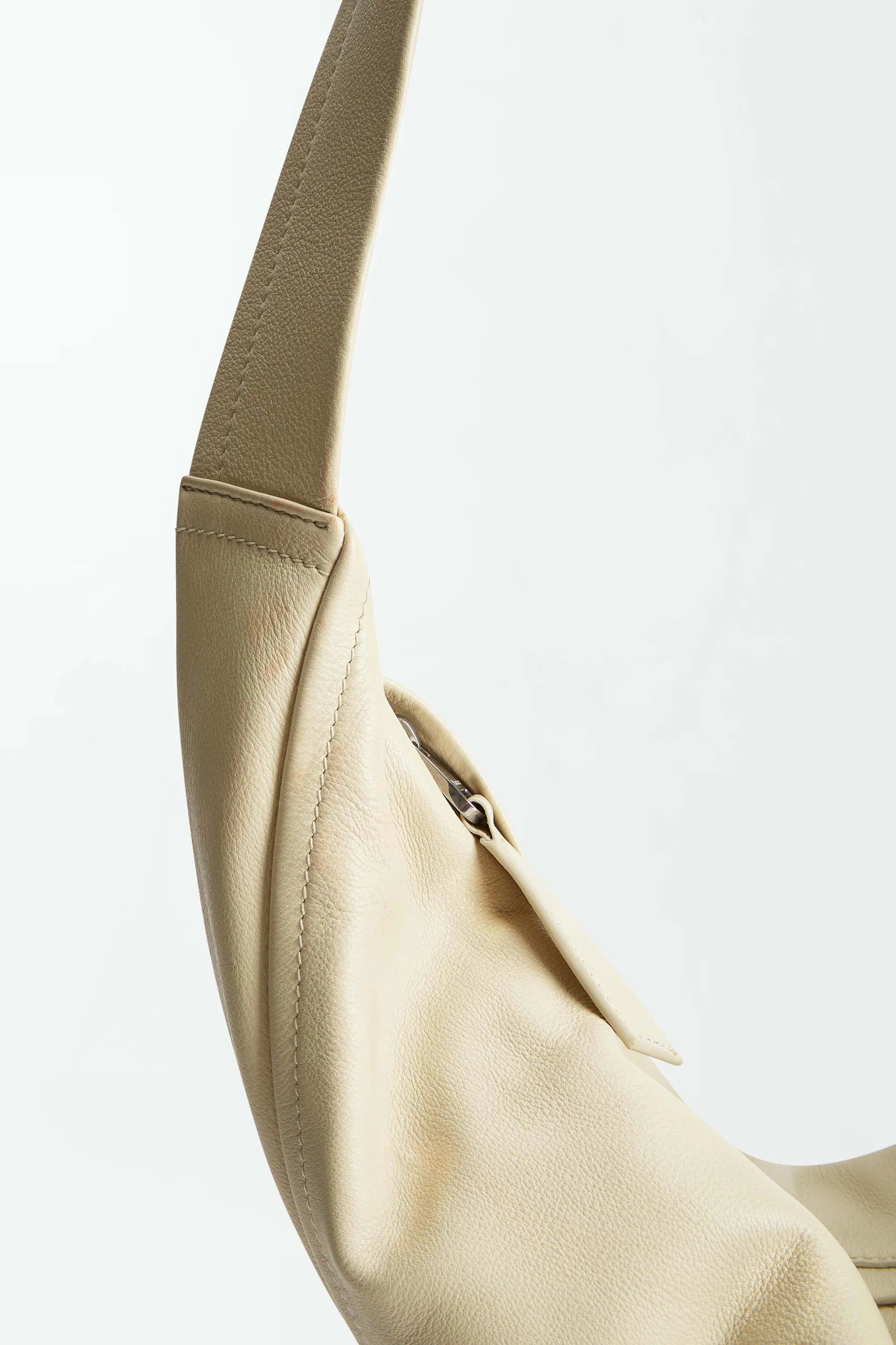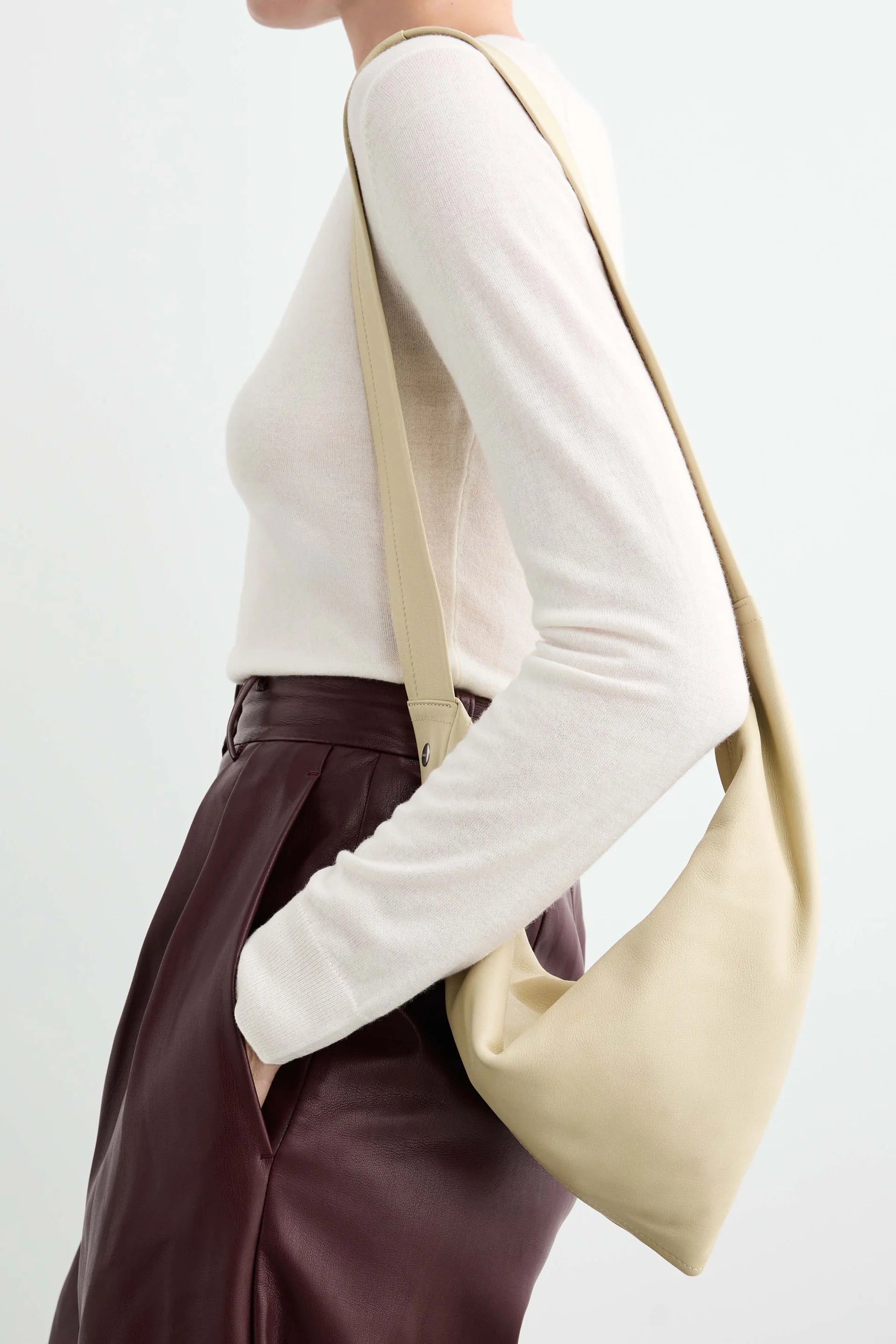 Softly structured shoulder bag in supple nappa leather with a fluid, draped silhouette that sits effortlessly under the arm. The dynamic shape molds gently to the body, making it as comfortable as it is elegant.
