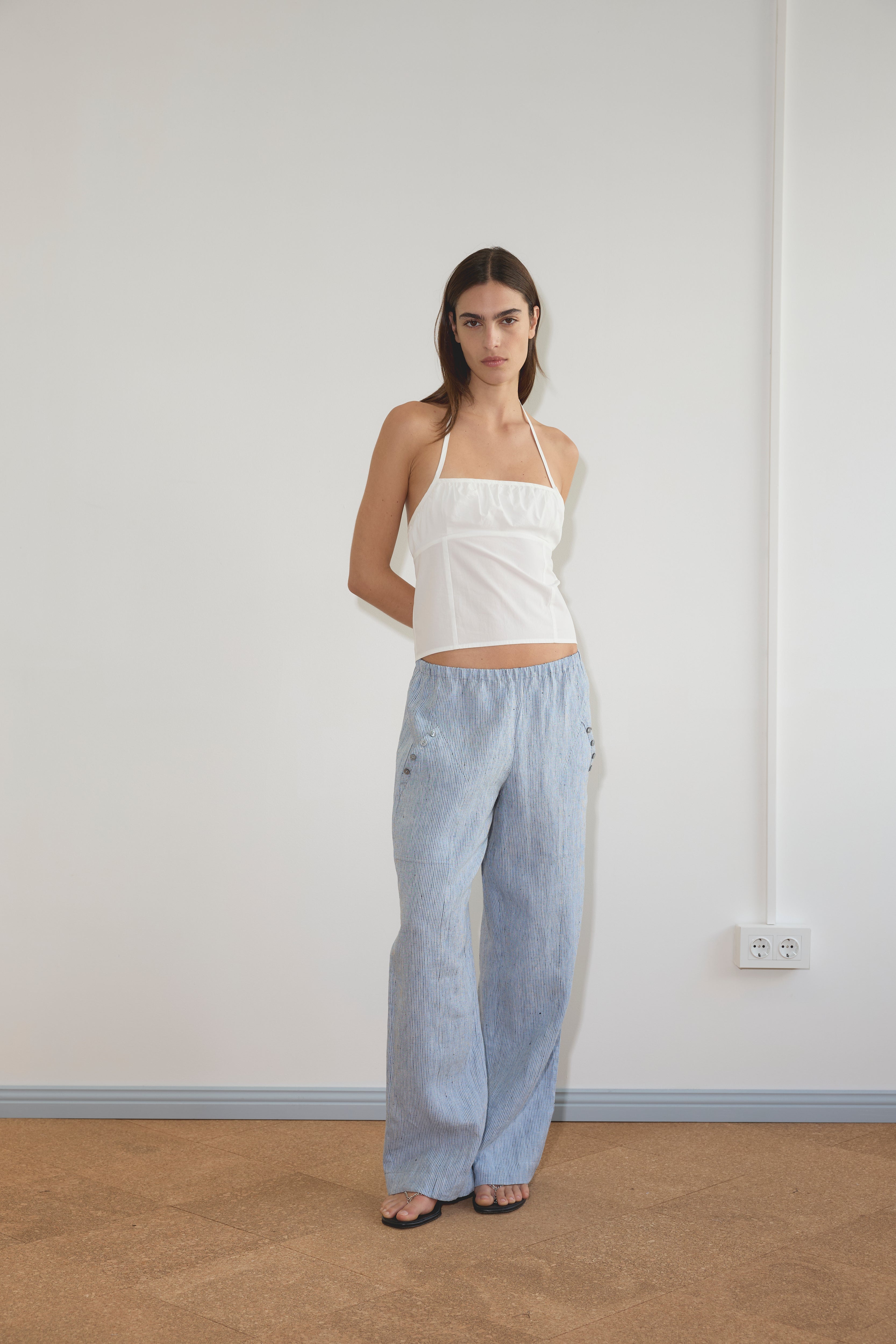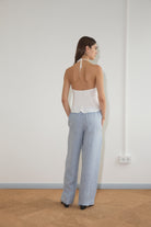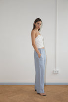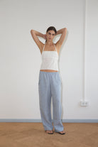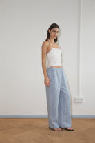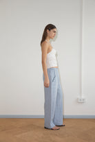 the angle pocket pant by Deiji Studios in blue stripe