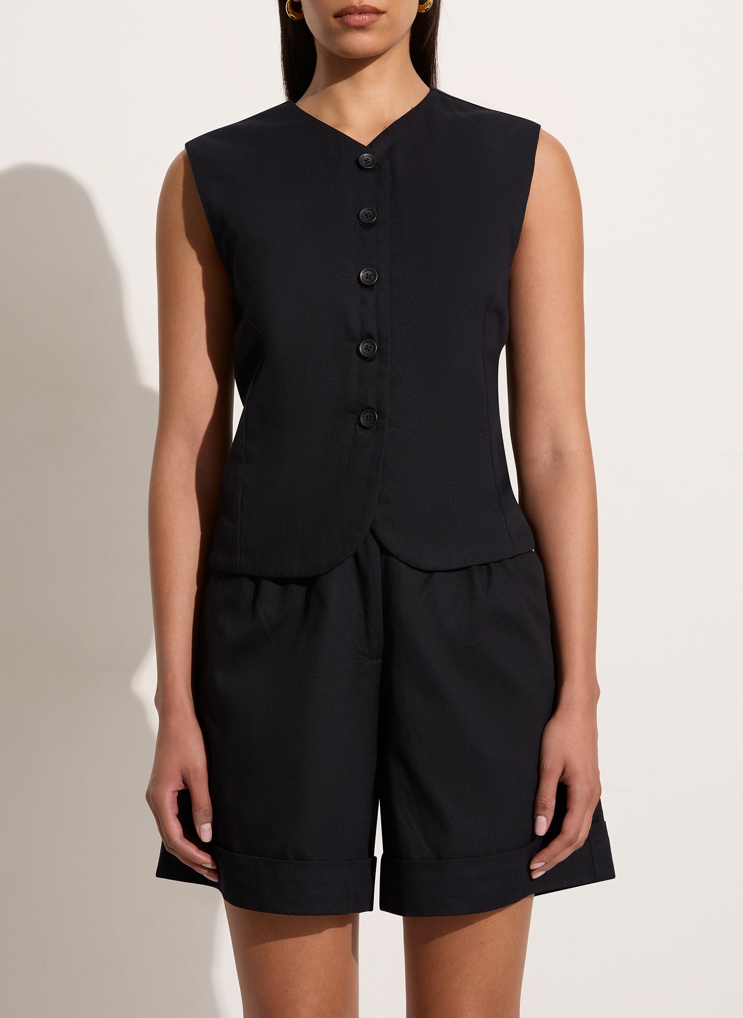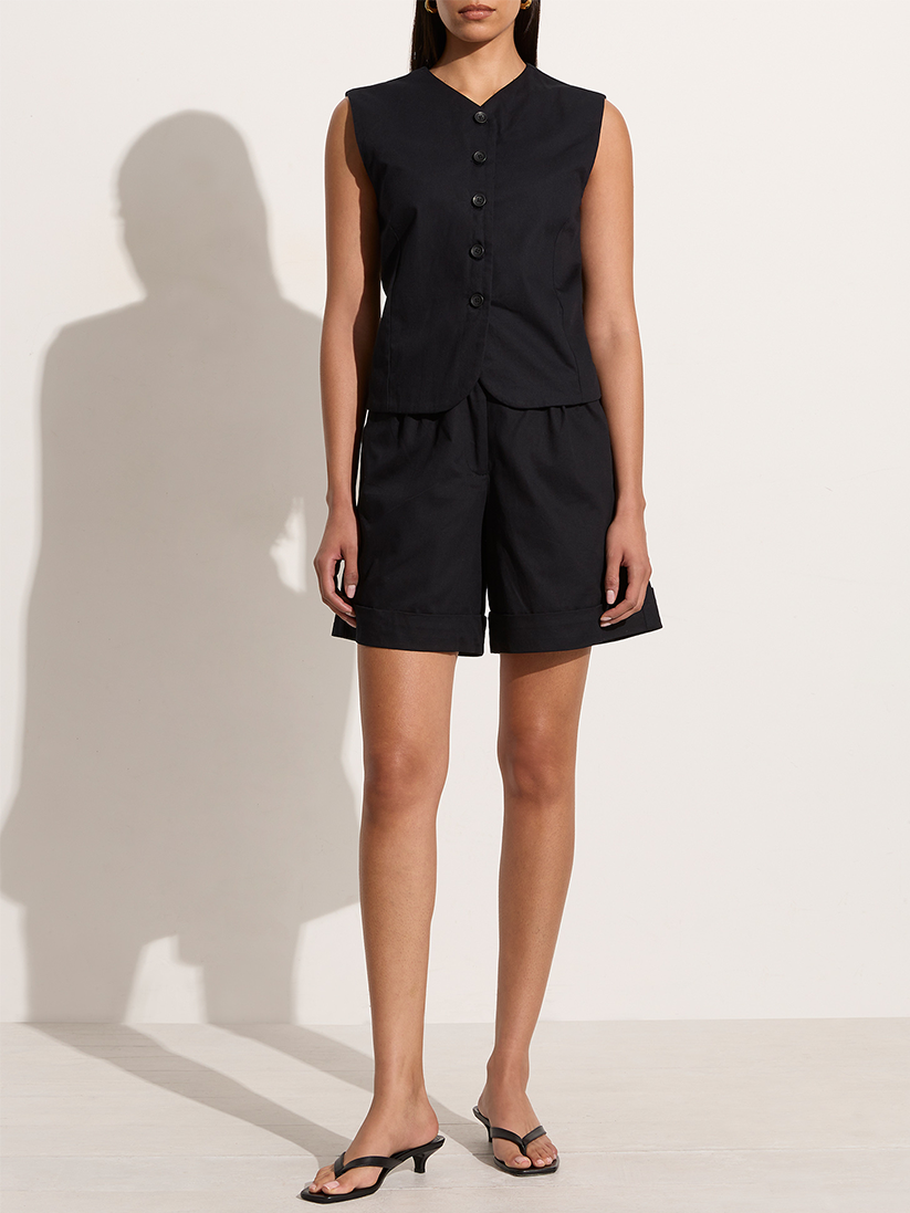 Softly tailored in cotton twill, the Campania Short in Black are mid-length tailored shorts offering a wide leg shape, front pleats and a cuffed hem for a relaxed finish. The waistband is designed for a high-rise fit and features an elasticated back panel for easy wear. Pair it with the Delfina Vest for a tailored two piece set.