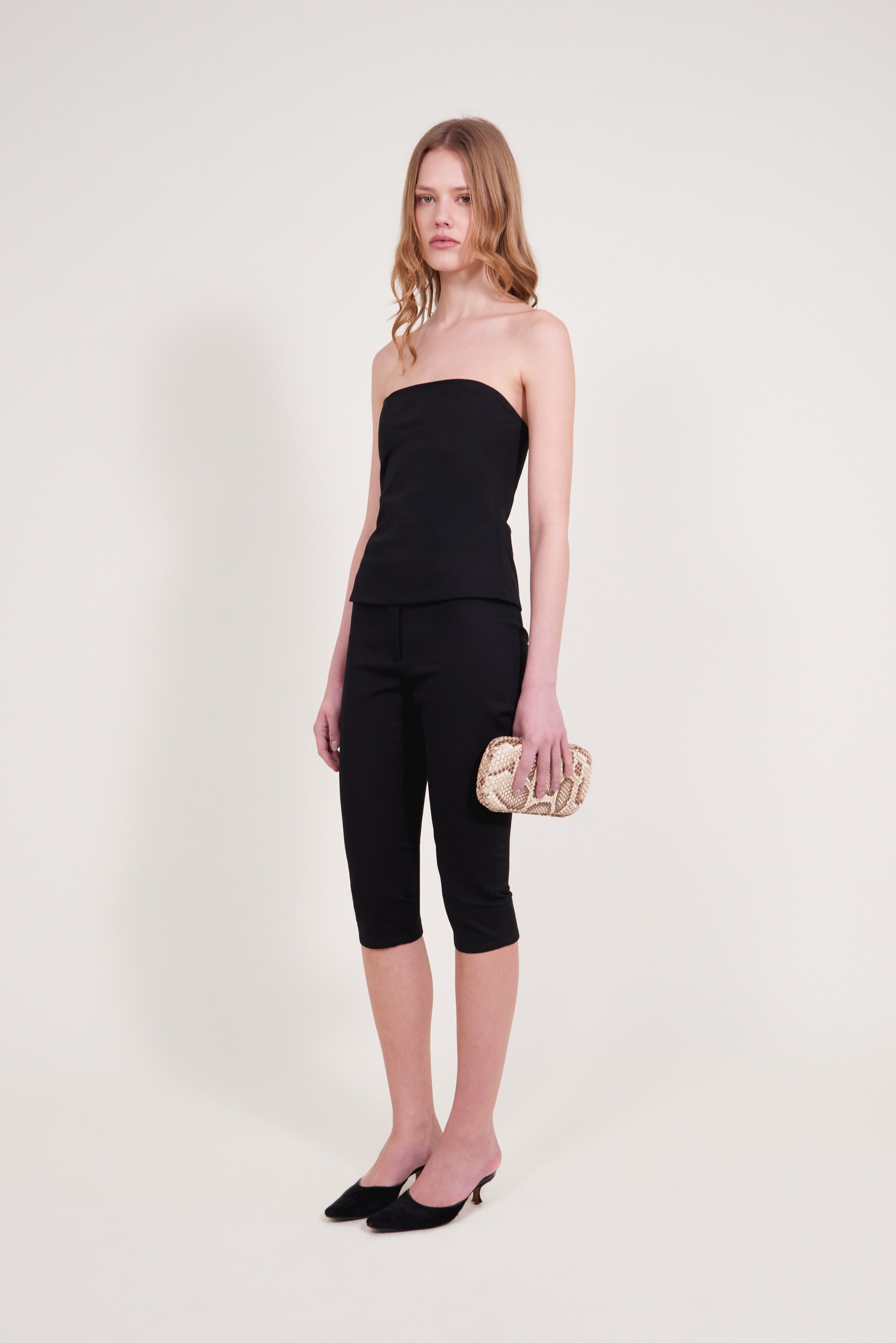 The Capri Pants are a modern take on a 90's-inspired style. Sitting just above the knee, they bring a fresh twist to the classic suit trouser. Designed with a low waist, front zip and internal hook, the fabric has a slight stretch for comfort & ease of movement as well as a close, streamlined fit.