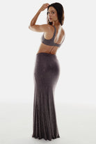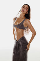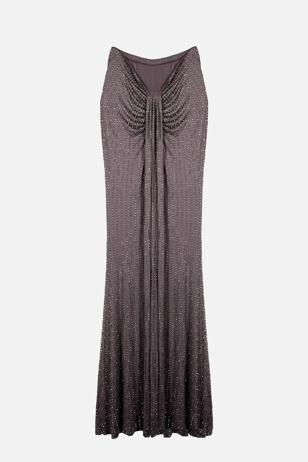 Crafted from premium microfiber with soft finish and pinstripe rhinestones embellishments. This iconic maxi skirt features a draped detail on the front and v cut on the waist. This statement piece is designed with versatility in mind, effortlessly transitioning from beach from to poolside to party. Available in a range of sizes to suit every body.