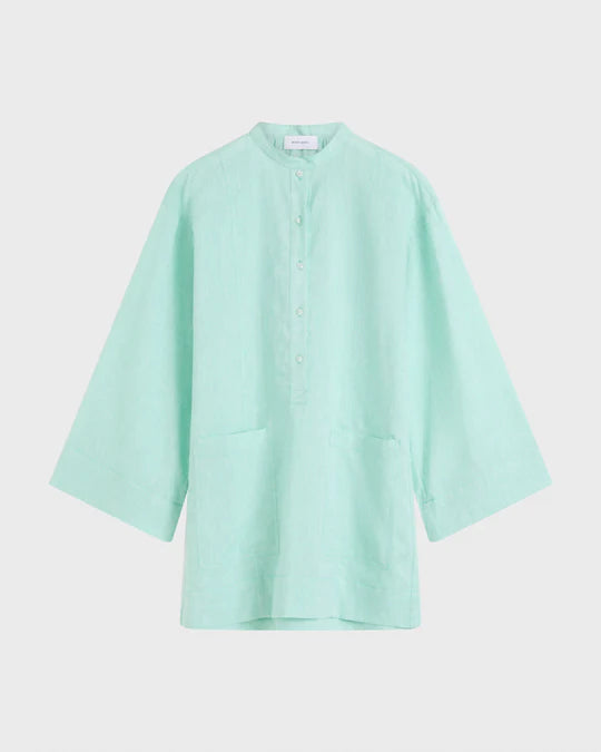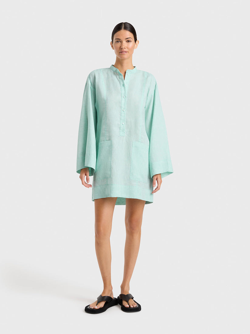 The Leiden linen Tunic in Mint is a long sleeve, loose fit dress cut from a crisp, light weight, 100% organic linen that has been milled by a Masters or Linen™ using European Flax. This effortless day dress features flared oversized sleeves, a stand collar, buttoned placket at centre front and large patch pockets. Slip over swimwear and pair with chunky summer sandals for an understated, chic weekends.