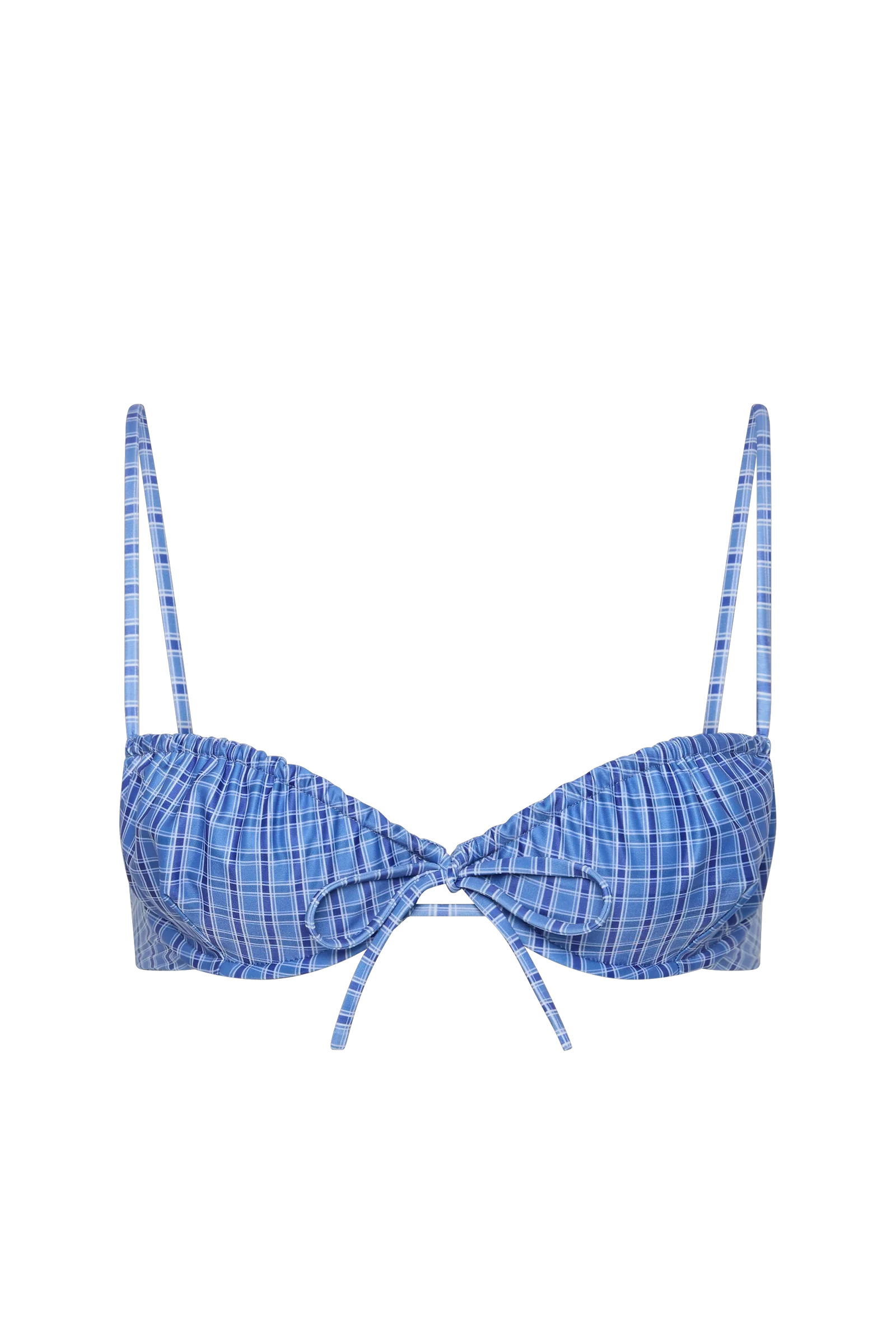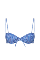 A balconette-style bikini, designed from a 100% blend of recycled materials, including polyamide and elastane, in a nostalgic blue gingham. With underwire through the bust and a front tie detail, adjustable for more or less coverage, it is fixed at the back with a simple clasp. Style with the matching Leone Bikini Bottom or Paloma Pant for long days by the hotel pool.