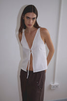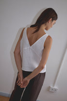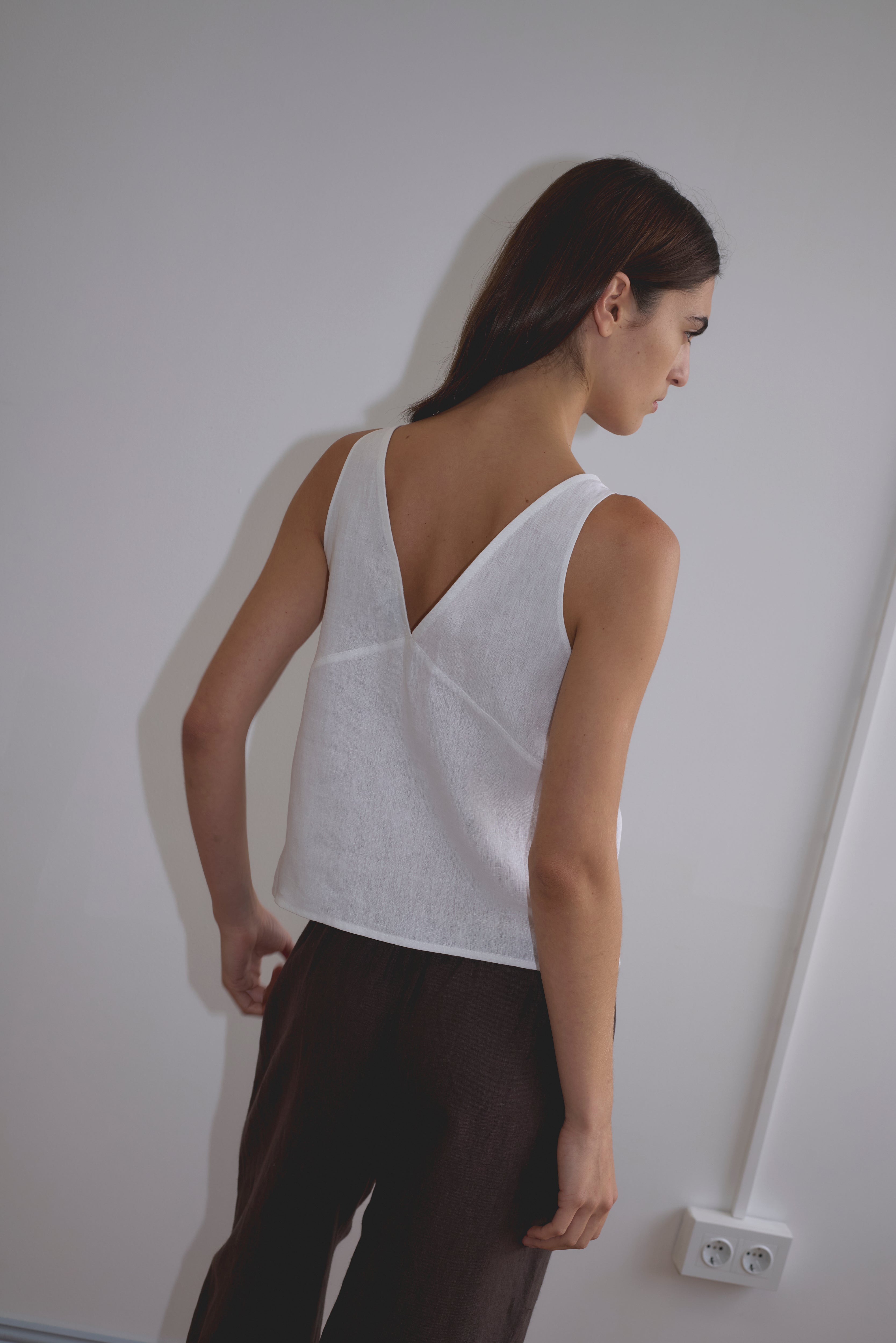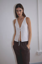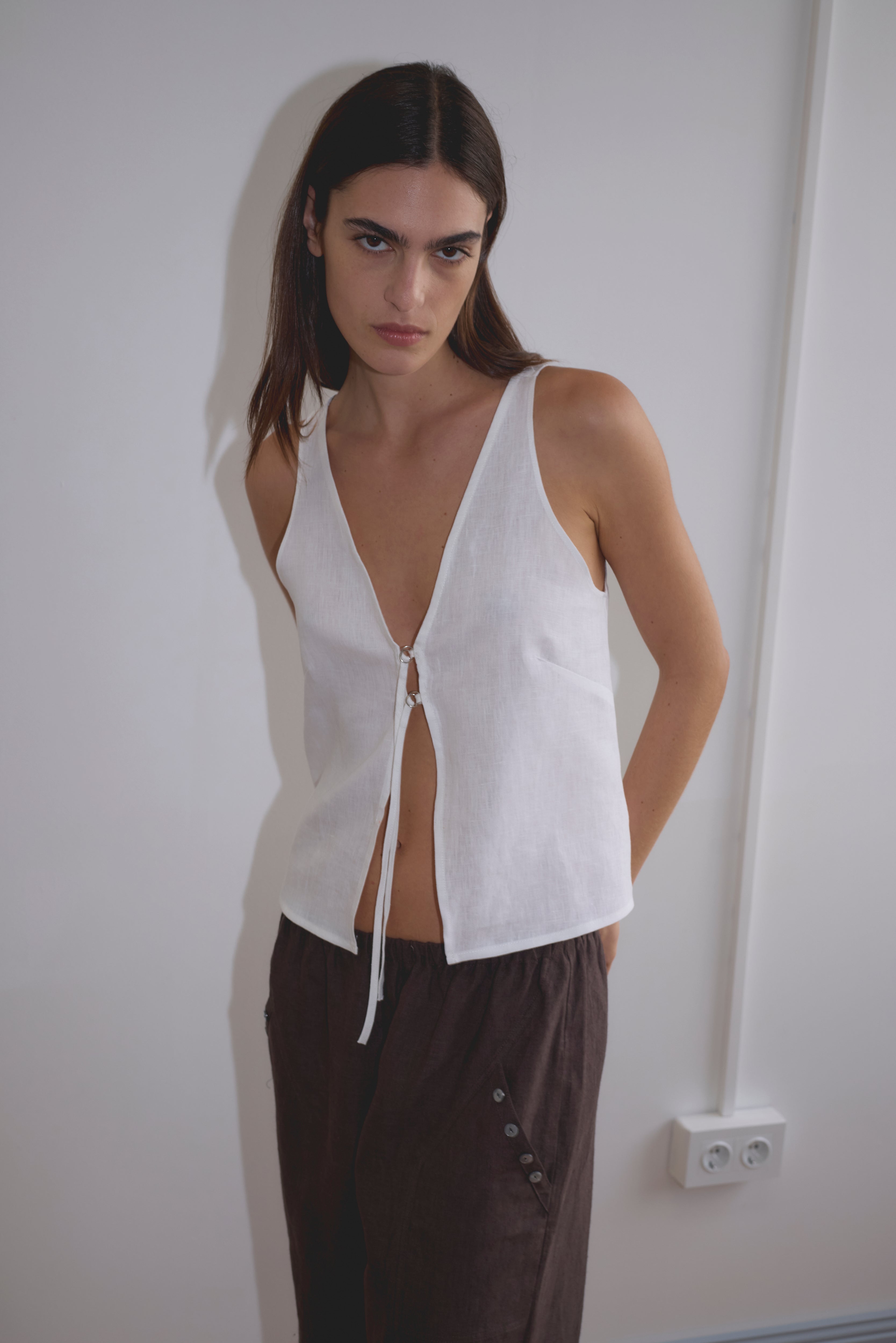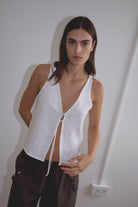 the two part top by Deiji Studios in whitea relaxed top featuring a flattering v-neckline and d ring closure wear the ties to the front or back for a versatile lookmade from 100% OEKO-TEX 100 certified and EU certified stone washed french linen