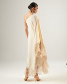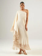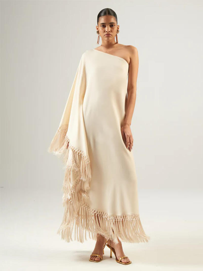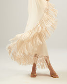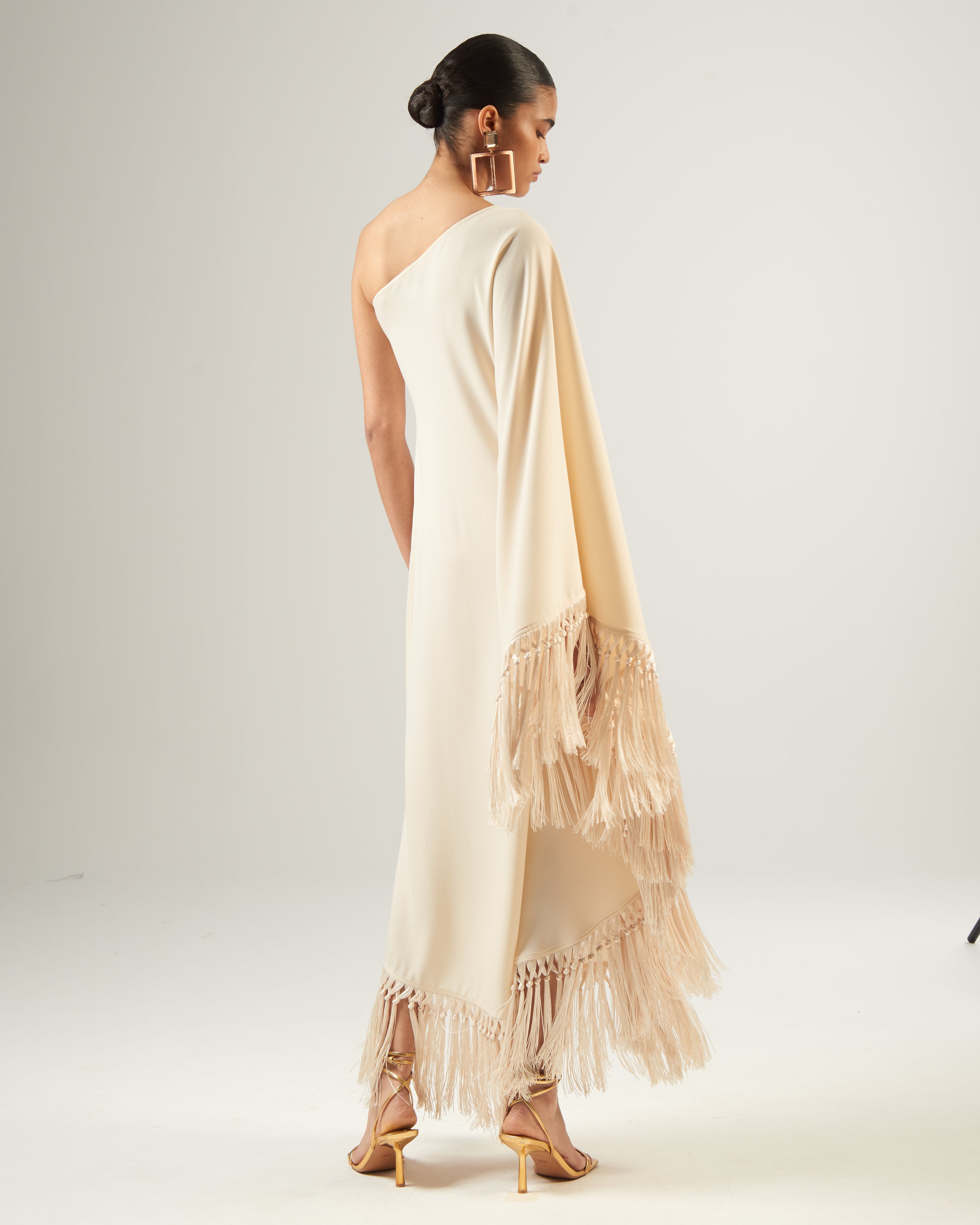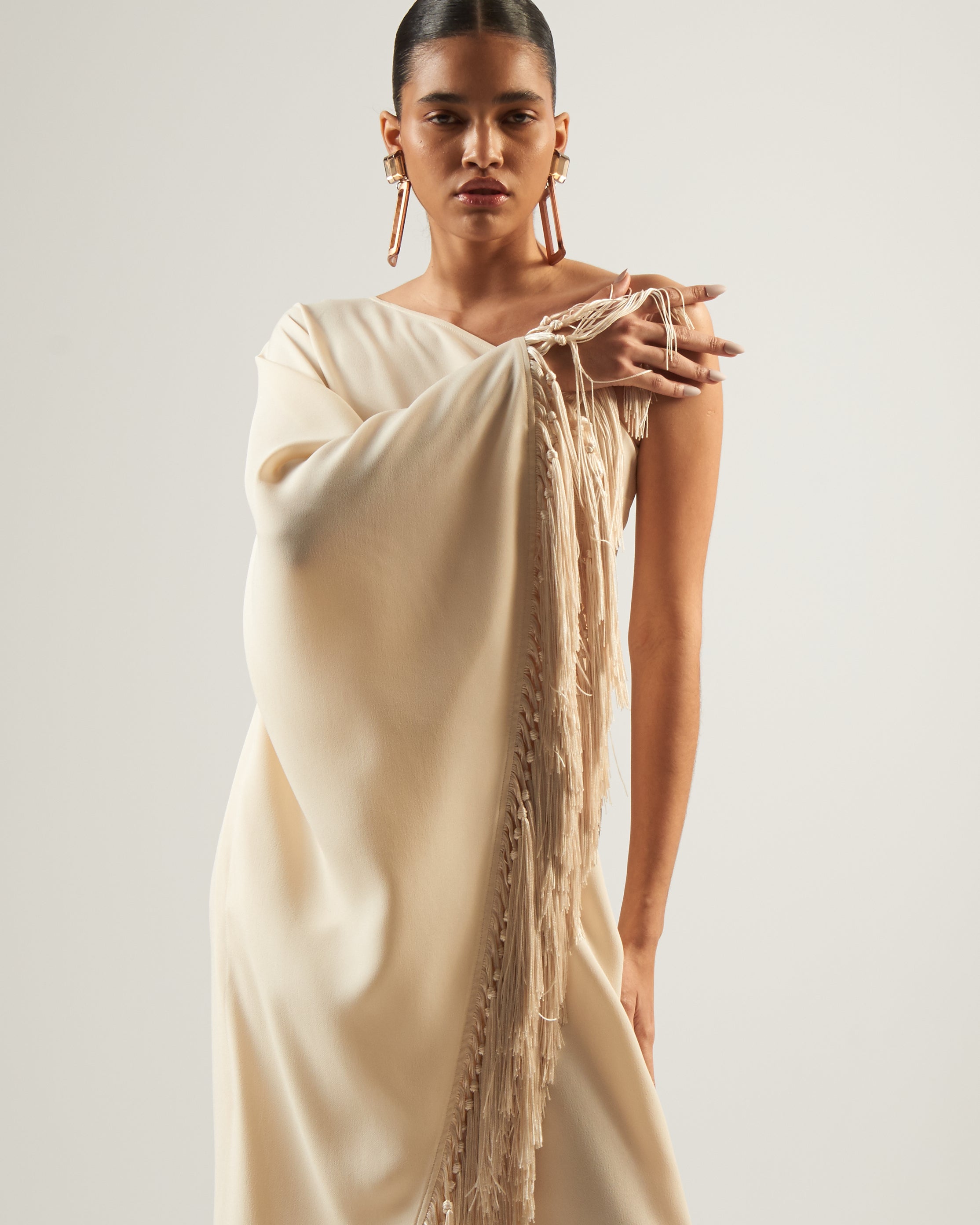 The Arno is a fabulous one-shoulder dress made from viscose-blend crepe cady. The long sleeve and hem are fully trimmed with four meters of playful and fresh hand-tied tonal fringes.