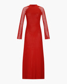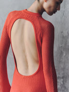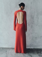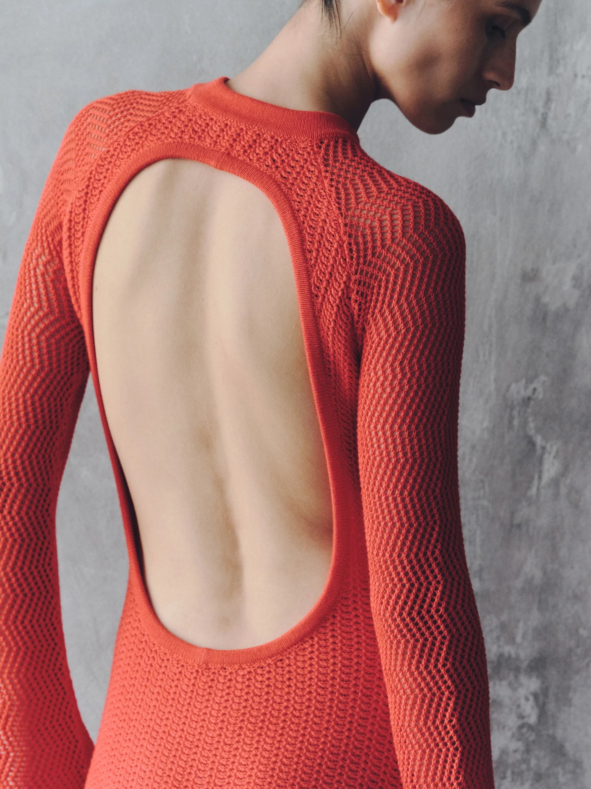The CUMBRE Maxi Dress is a striking long-sleeve design that blends elegance with a hint of allure. Crafted from 100% cotton, this machine-knitted maxi dress features a dense knit body for a sleek and structured look, complemented by openwork sleeves that add a touch of delicacy. A high neckline enhances its refined silhouette, while an open back introduces a bold and sophisticated element. The CUMBRE Maxi Dress is a timeless piece perfect for making an unforgettable impression.
