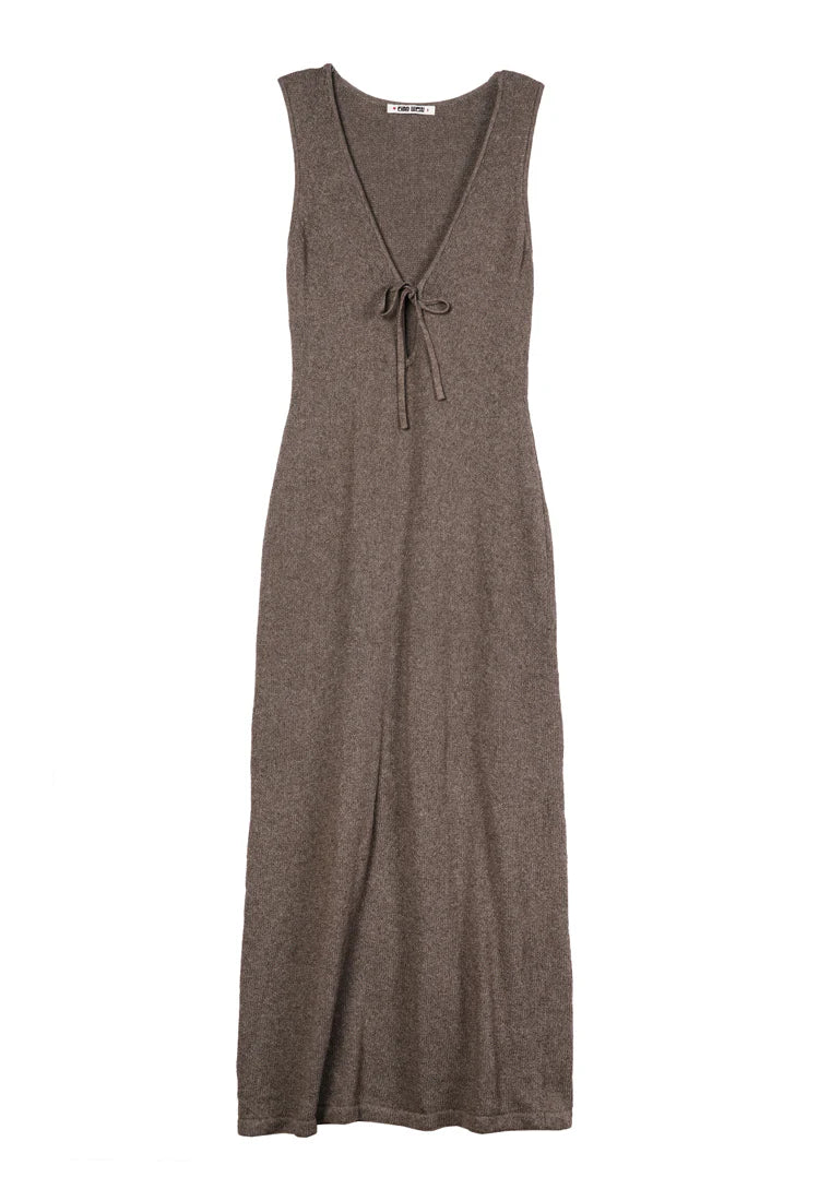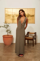 The Delphinus Dress in Reed is a knit maxi dress, featuring a tie front.