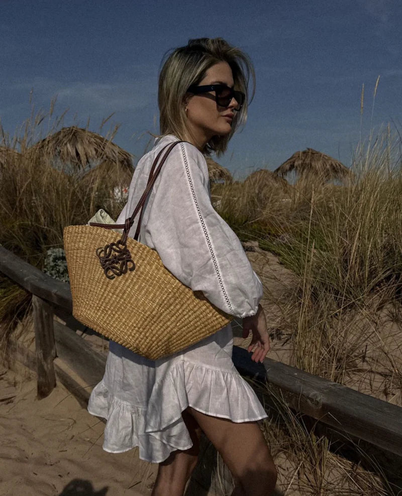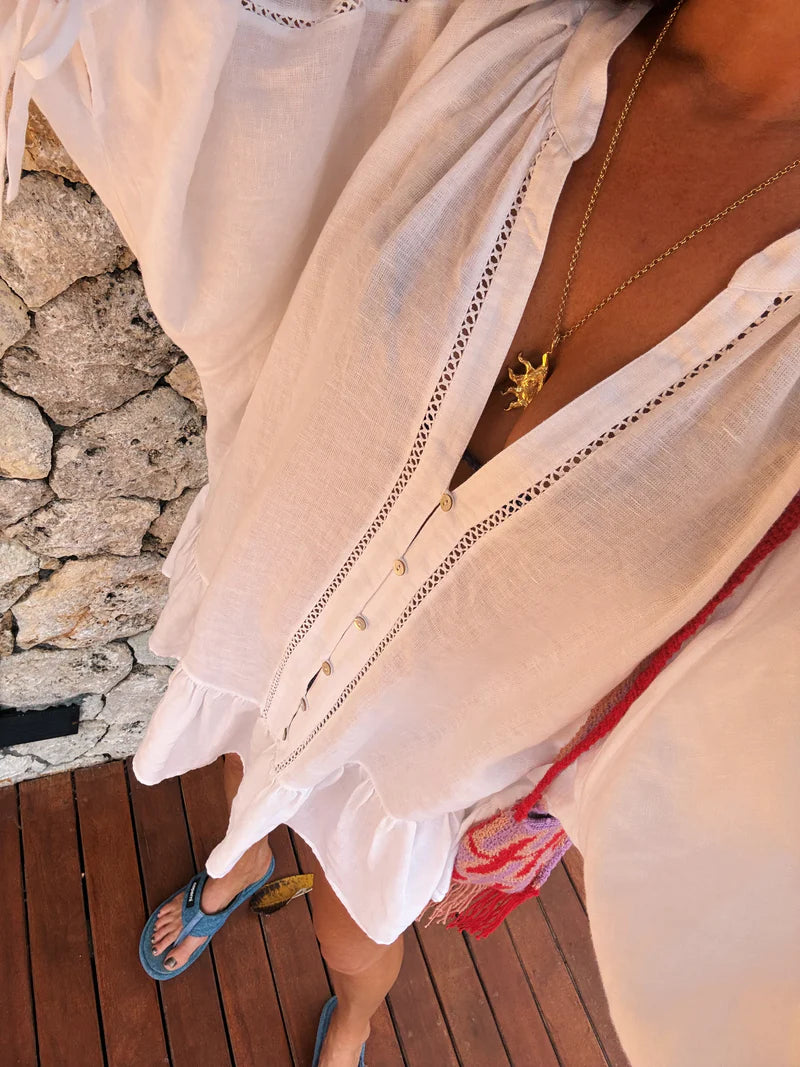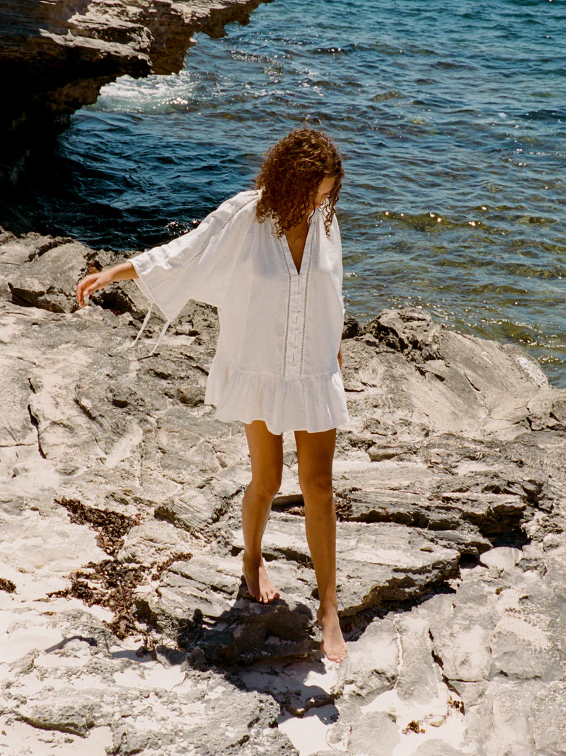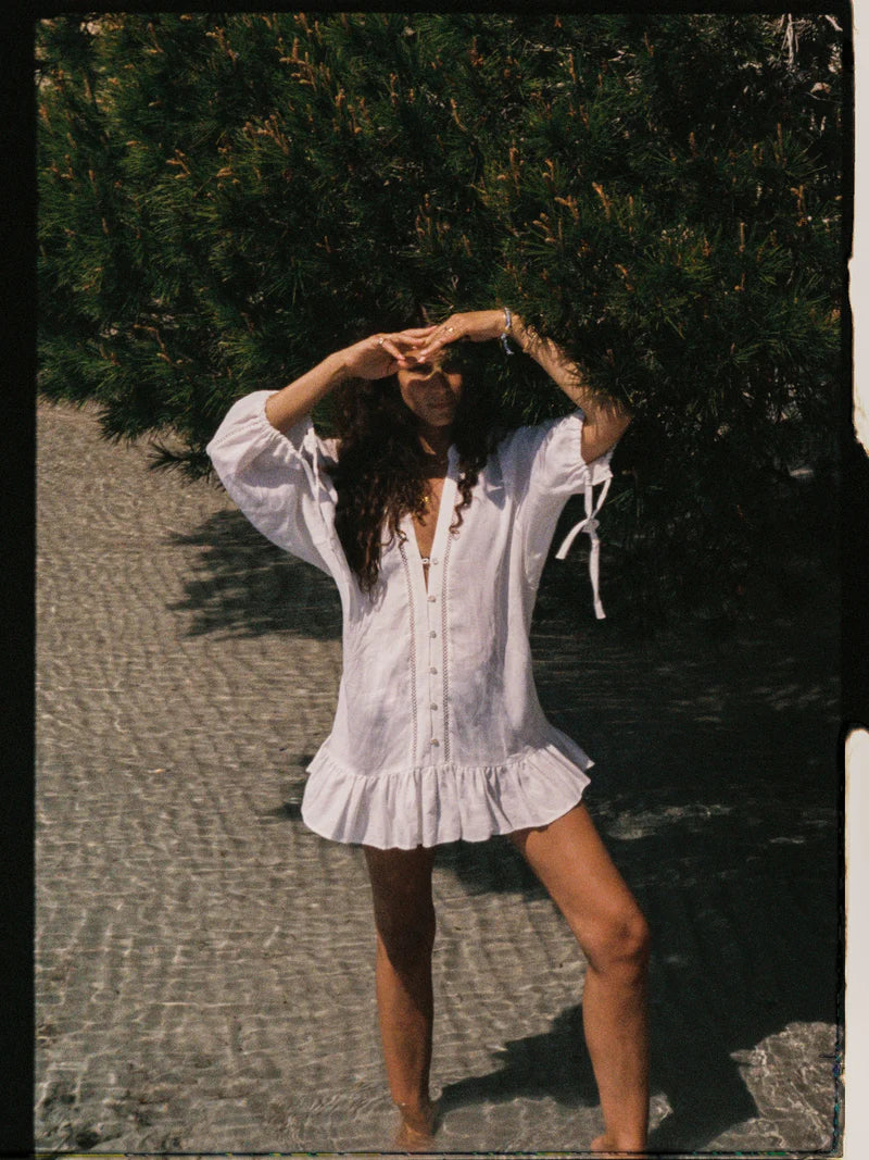 Signature 'throw-on dress' for those beach to bar days. Shell buttons down front, subtle ruffled hem, blouson sleeves with tie to fasten. Features inserted cotton 60's style trim throughout.