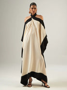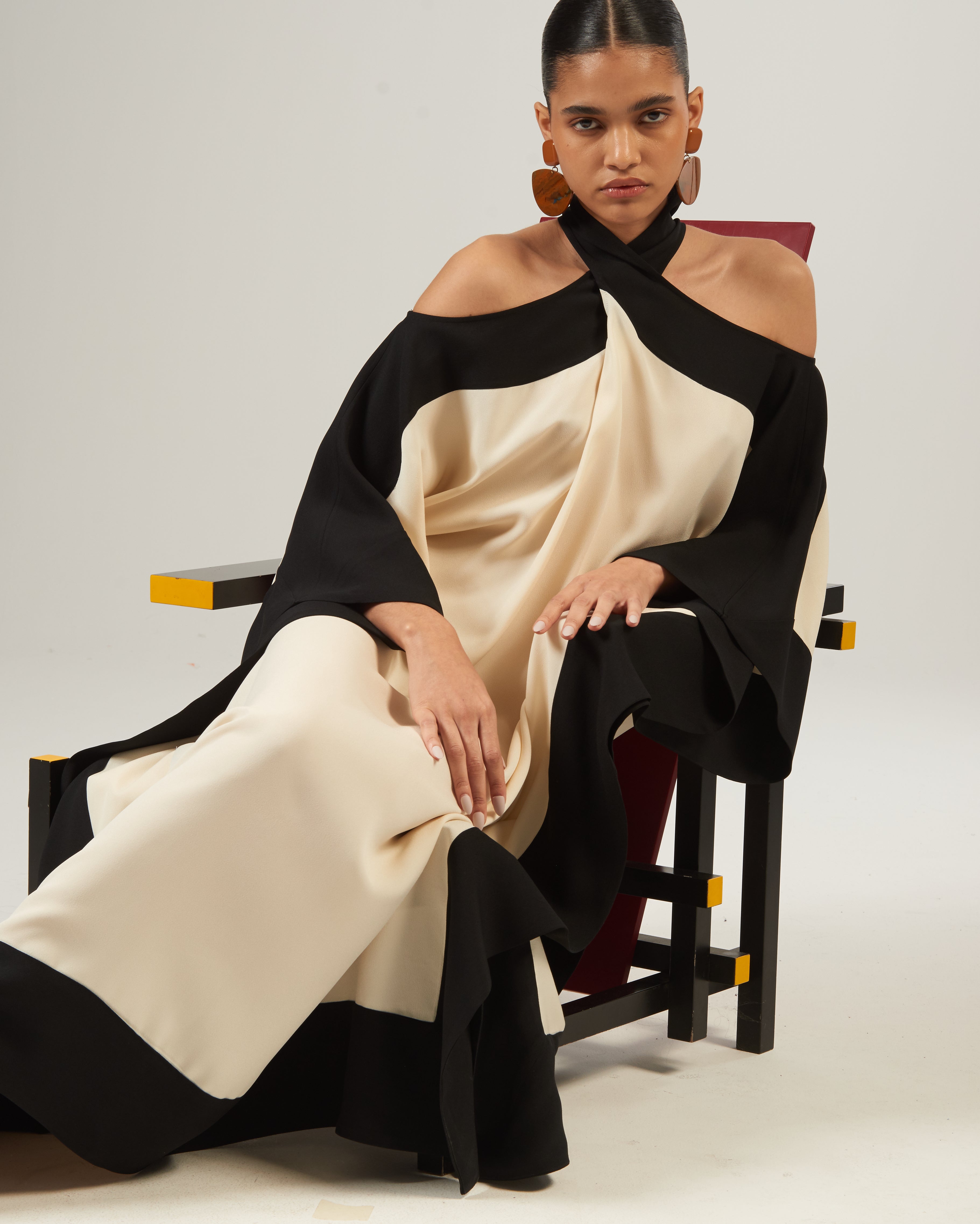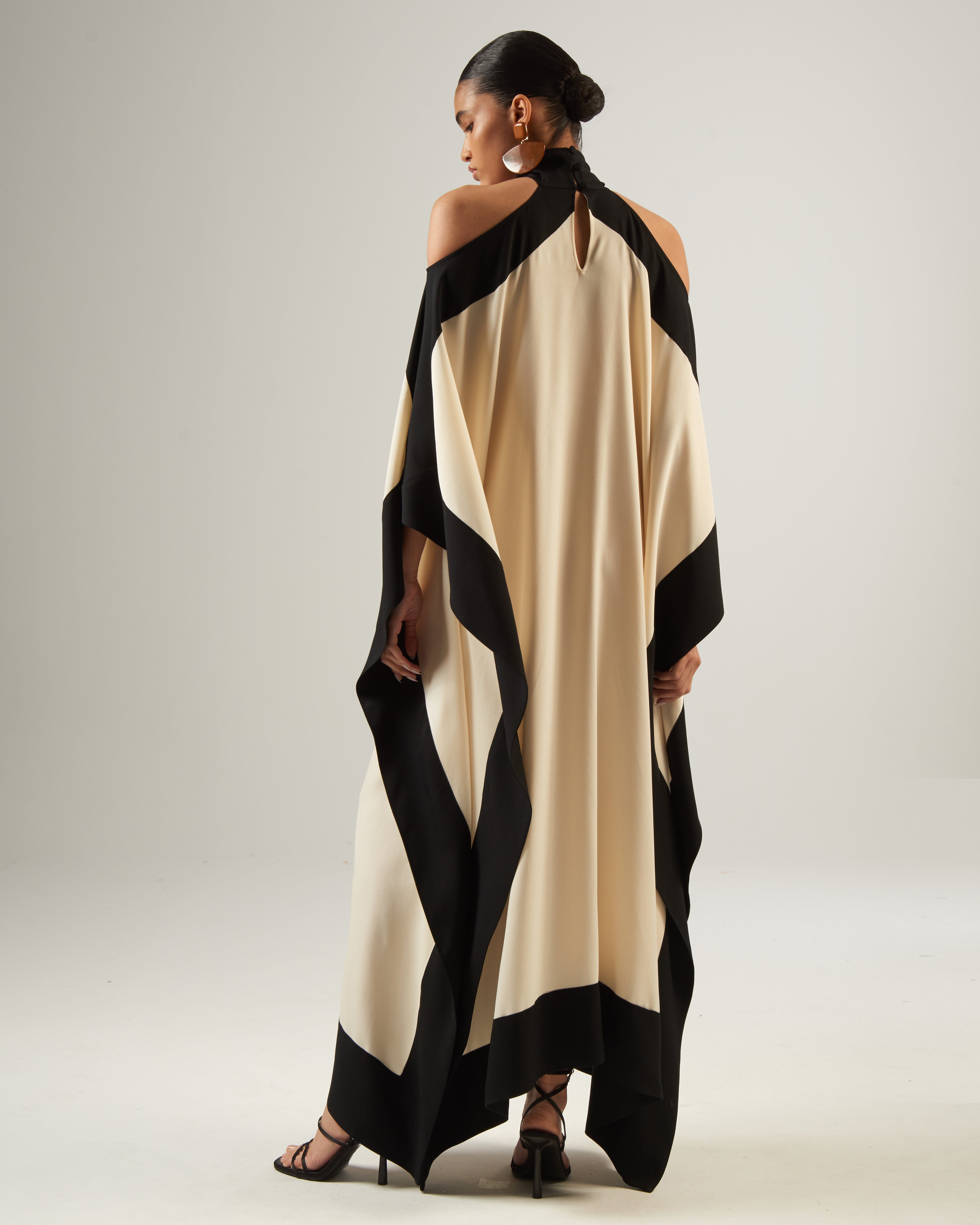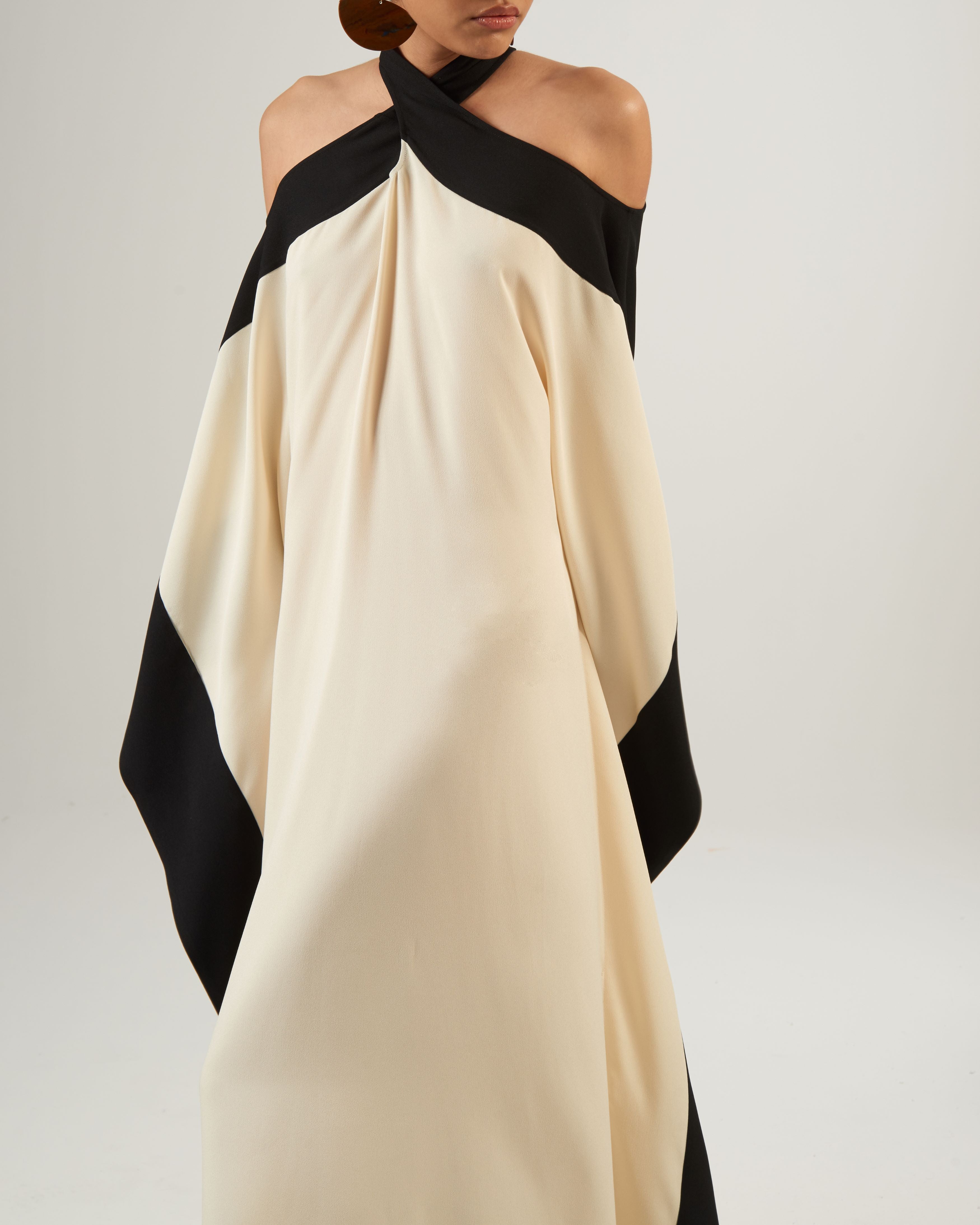 The Mambo Corniche is a cold-shoulder kaftan with a cross neck that drapes and adds movement to the garment. Masterfully made with intarsia technique, the black frame creates an optical effect, making the cross neck the focal point.