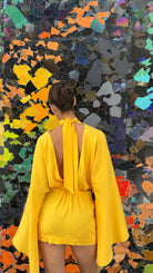 This Taller Marmo mini dress features a crewneck, relaxed fit, long bell sleeves, and a straight hem. It is crafted in tech fabric with an adjustable belt on the front and a maxi bow on the rear. The cuffs are tied.