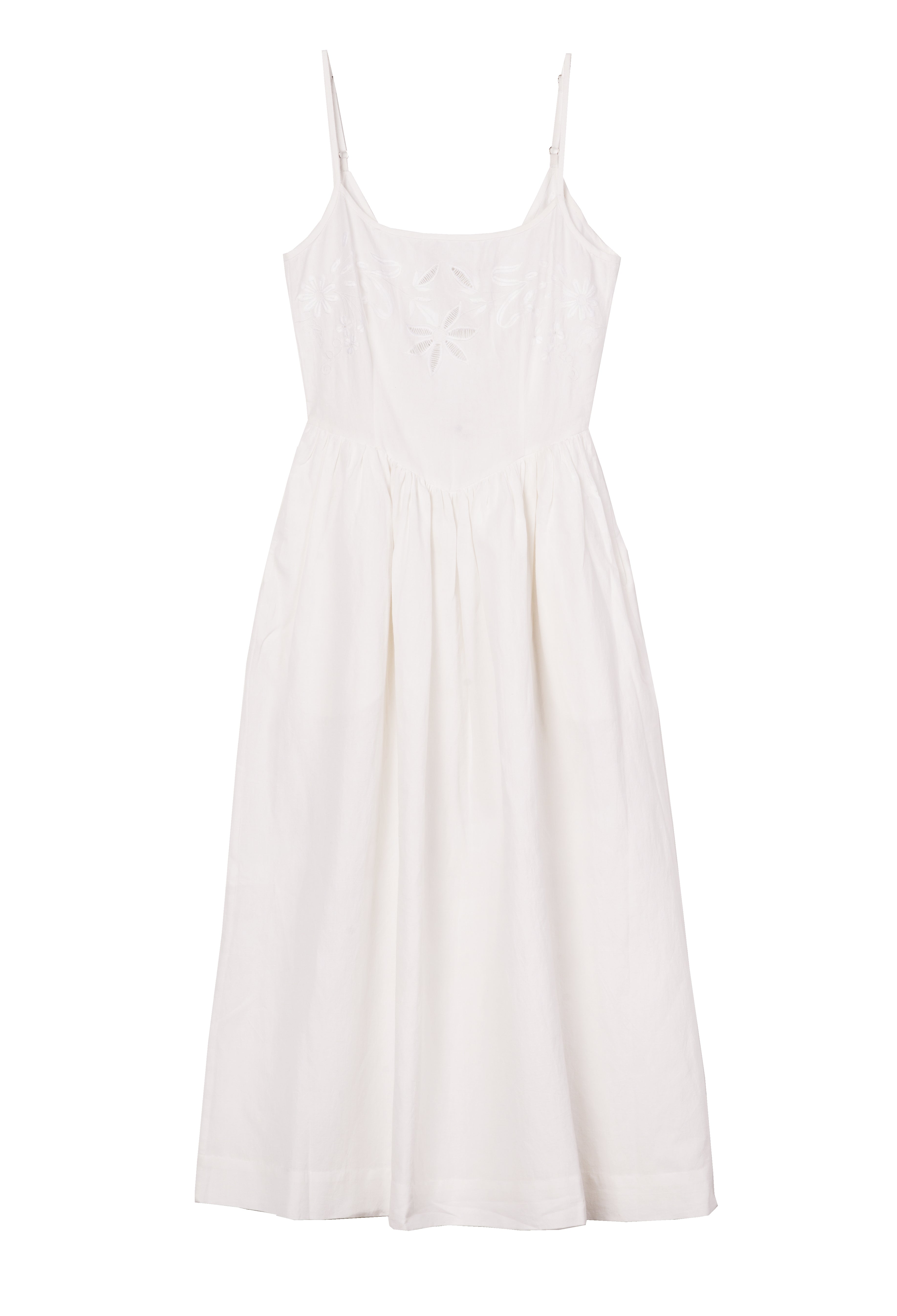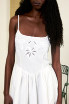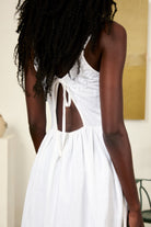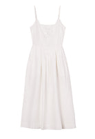 The Neroni Dress in white is a spaghetti strap cotton voile ankle length dress with a fitted bodice, princess waistline, and a full skirt. The dress features an open back with tie closure. Stretchy elastic at back. Straps are adjustable.