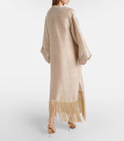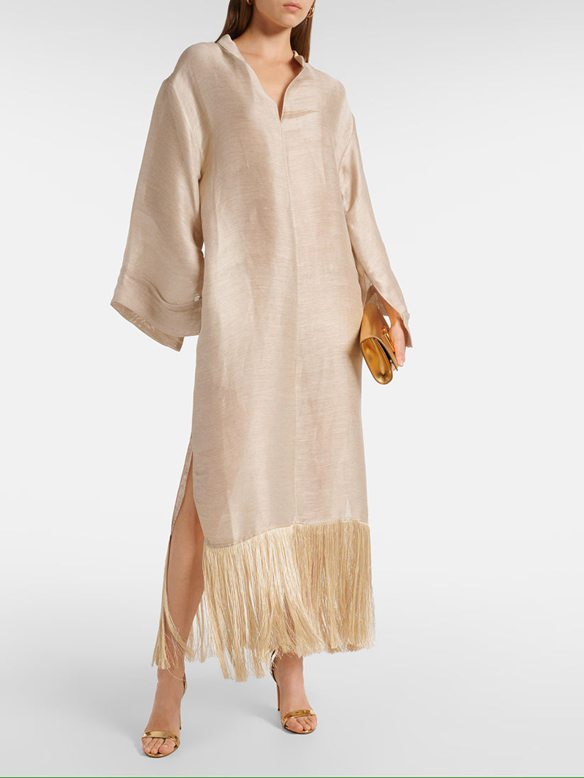 Taller Marmo's 'Tigris' gown is made from linen-blend dupioni - the premium textile has a satin-like luster, but is more structured, and organically wefted. It has a loose shape with wide sleeves and a dramatic fringe that sways beautifully as you walk.