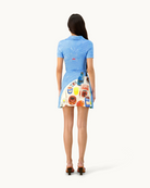 Blue polo dress with table setting print, combining comfort, freshness and originality.