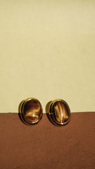Gold plated oval shape earring with cateye brown stone