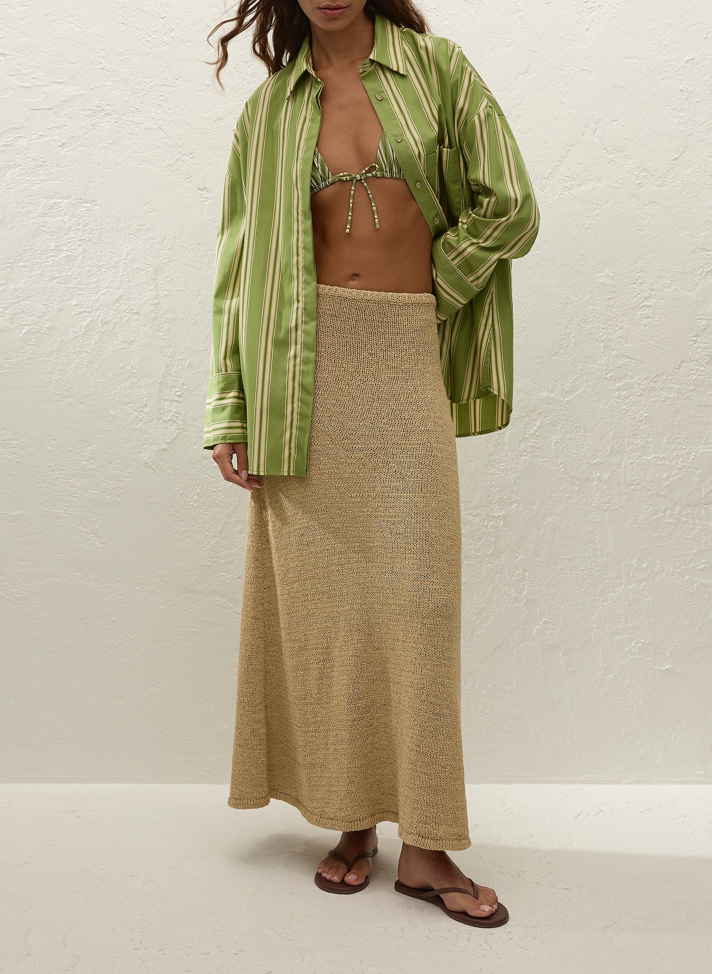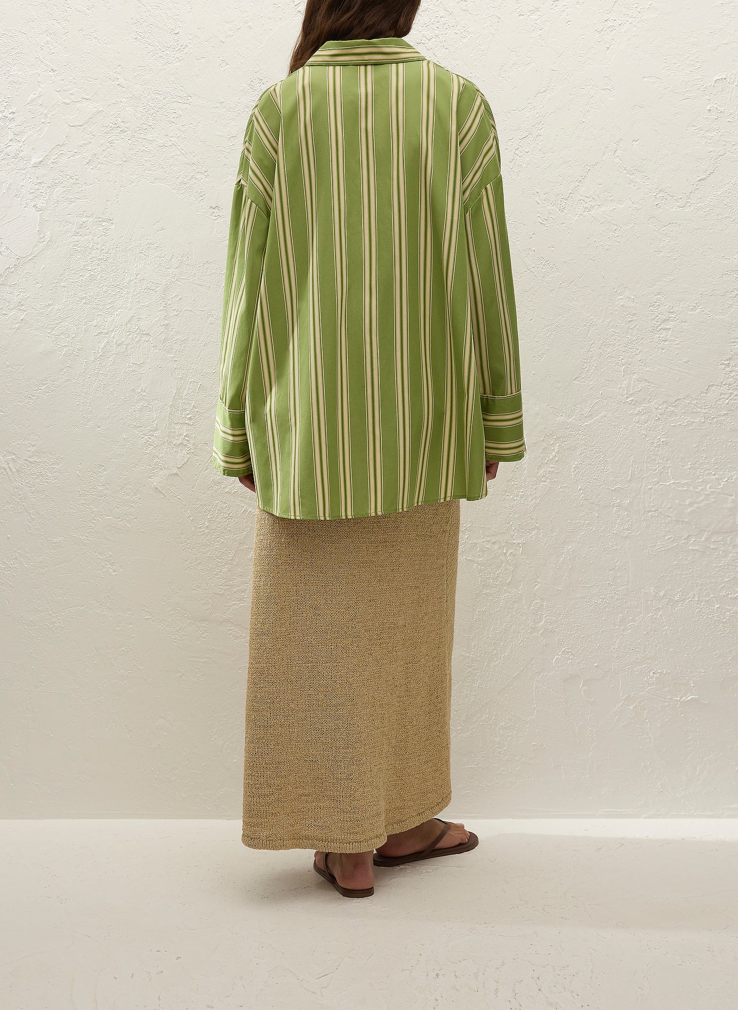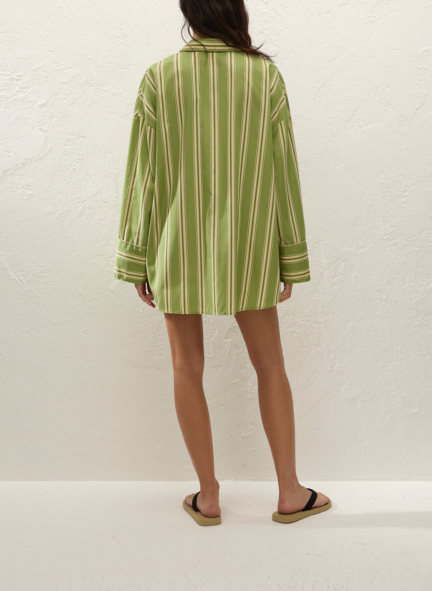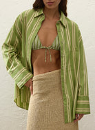 An oversized boyfriend-style button-up shirt, designed from a signature 100% BCI Certified organic cotton yarn-dyed in a vibrant green stripe. Featuring a classic collar and button-up front with a single chest pocket and wide cuff sleeves, it is intentionally relaxed in shape for effortless throw-on throw-off appeal. Style with the matching Lonia Shorts or over swim for long days by the ocean.