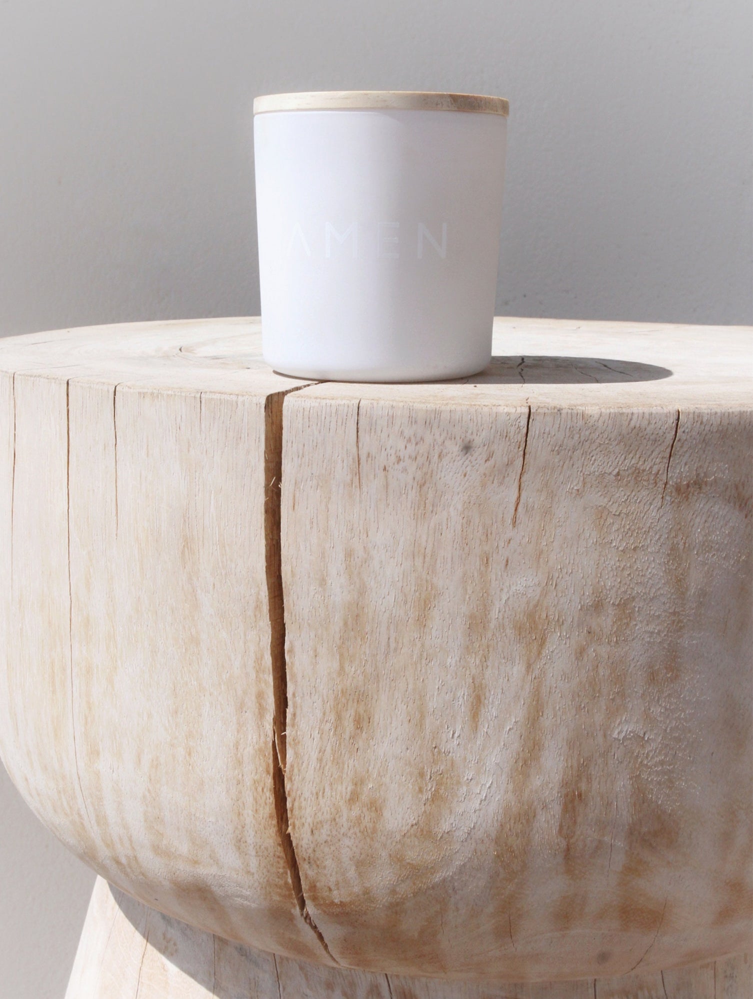 200 grs. of natural vegetal wax candles • white porcelain jar • reforested wood cover lid • CO2 negative emission, circular biodegradable mushrooms packaging
