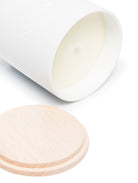 200 grs. of natural vegetal wax candles • white porcelain jar • reforested wood cover lid • CO2 negative emission, circular biodegradable mushrooms packaging