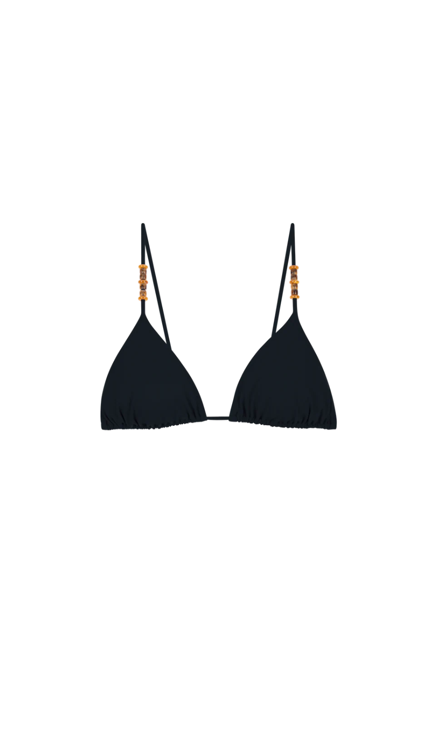 Calypso - their new triangle cut runs slightly small—size up for more coverage. Finished with amber-colored beads and adjustable back straps for the perfect fit.