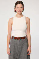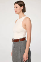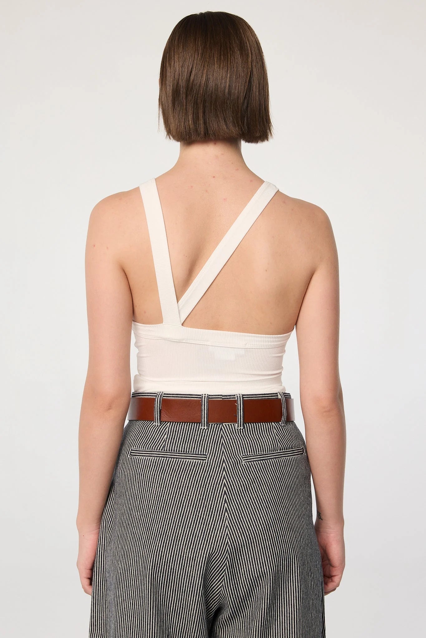 The Ximeno, one of their core tank tops and crafted from our signature light-weight stretch-rib. It is cut for a close fit and features thick binding, asymmetric straps, a curved baseball hem and an open back. Double-lined to minimize sheerness. Pair with slinky slip skirts or oversized trousers.