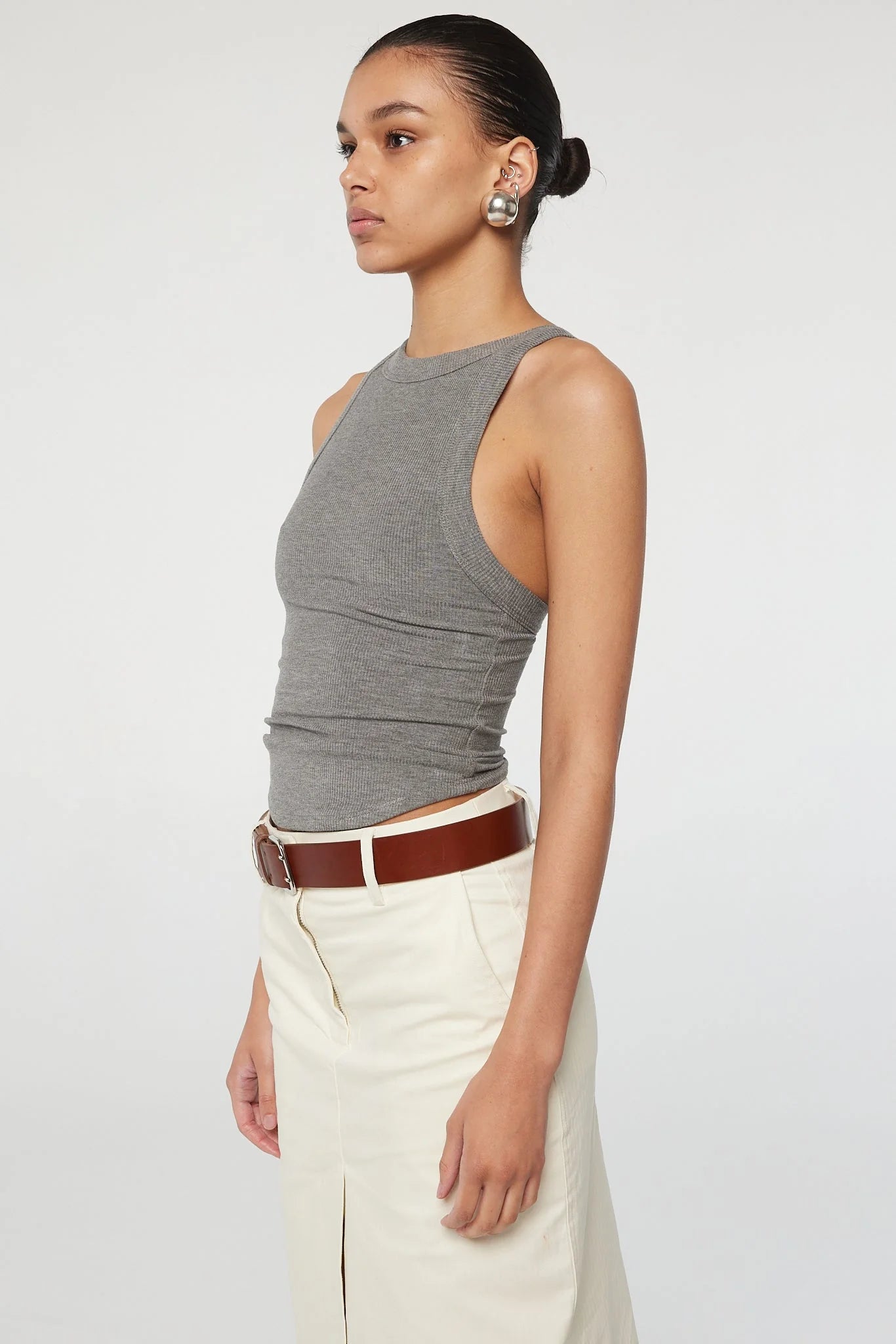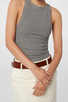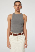 The Ximeno, one of their core tank tops and crafted from our signature light-weight stretch-rib. It is cut for a close fit and features thick binding, asymmetric straps, a curved baseball hem and an open back. Double-lined to minimize sheerness. Pair with slinky slip skirts or oversized trousers.