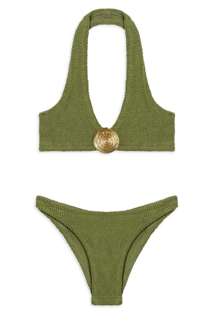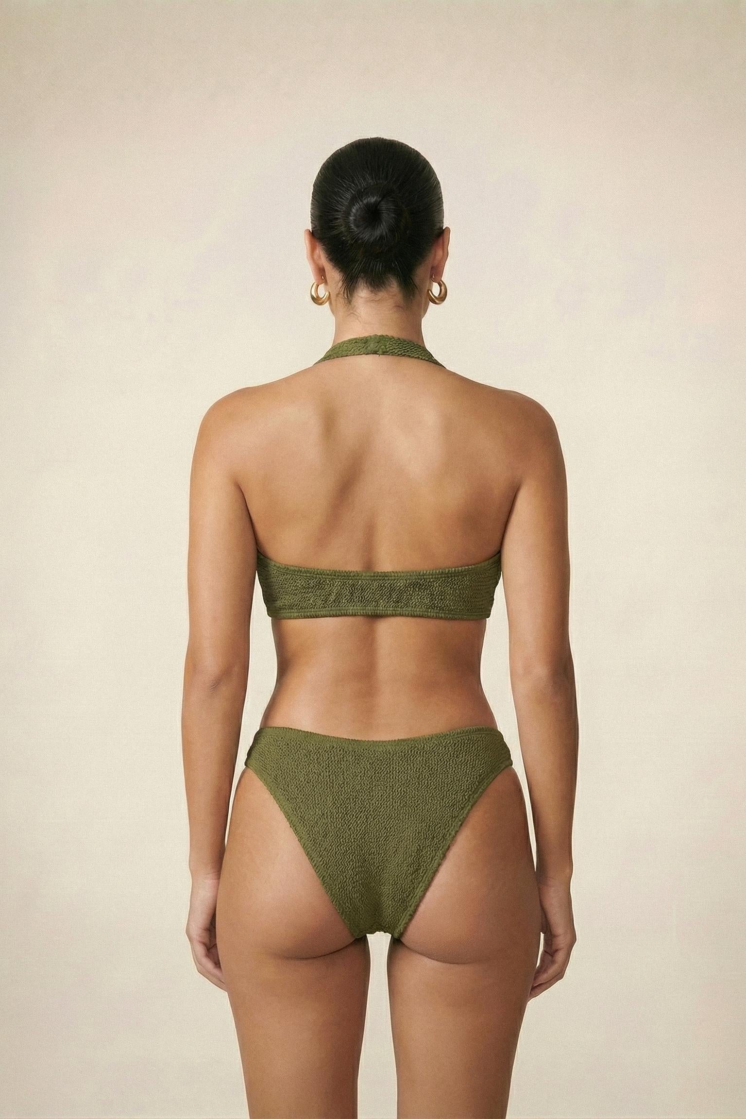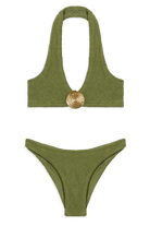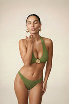 The Eris Bikini Set combines artisanal design with superior comfort. The halter top is adorned with a sculpture-like accessory, adding a refined and elegant touch.