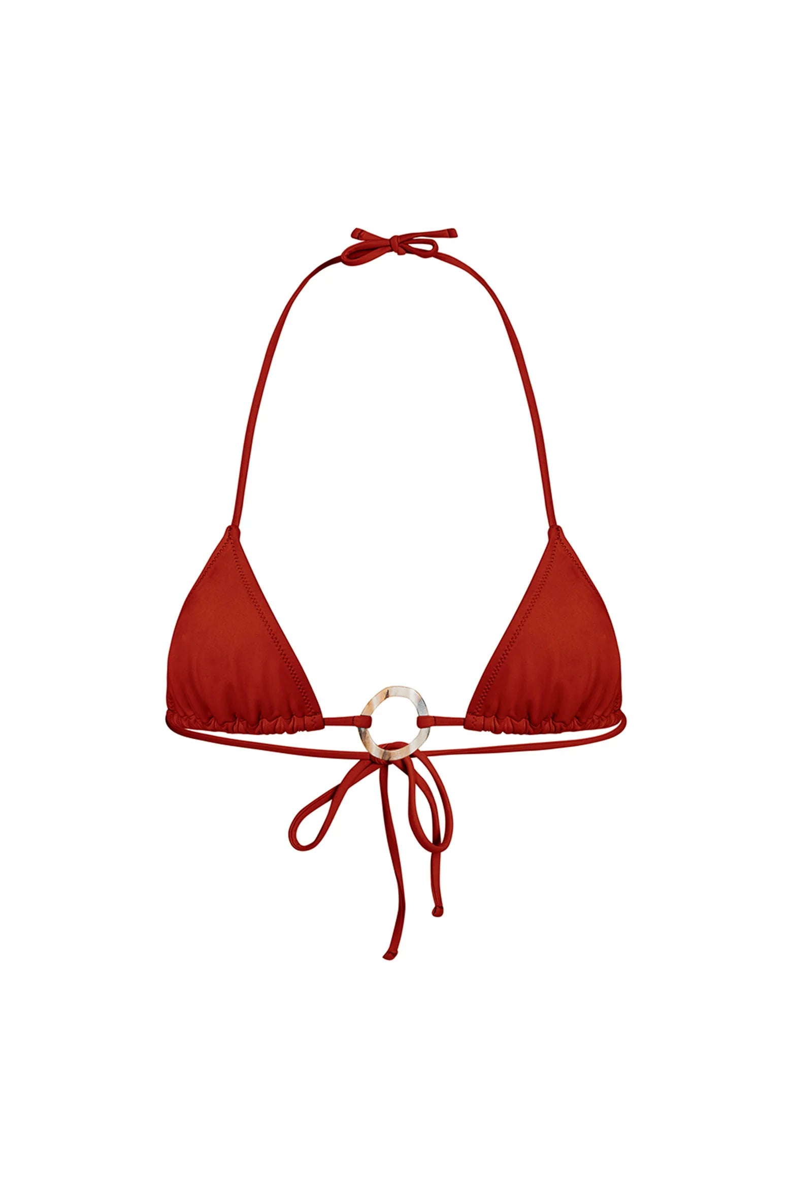 a classic triangle top with organic shaped ring at center front and strings that tie at the neck and back. made in our peach perfect fabric.