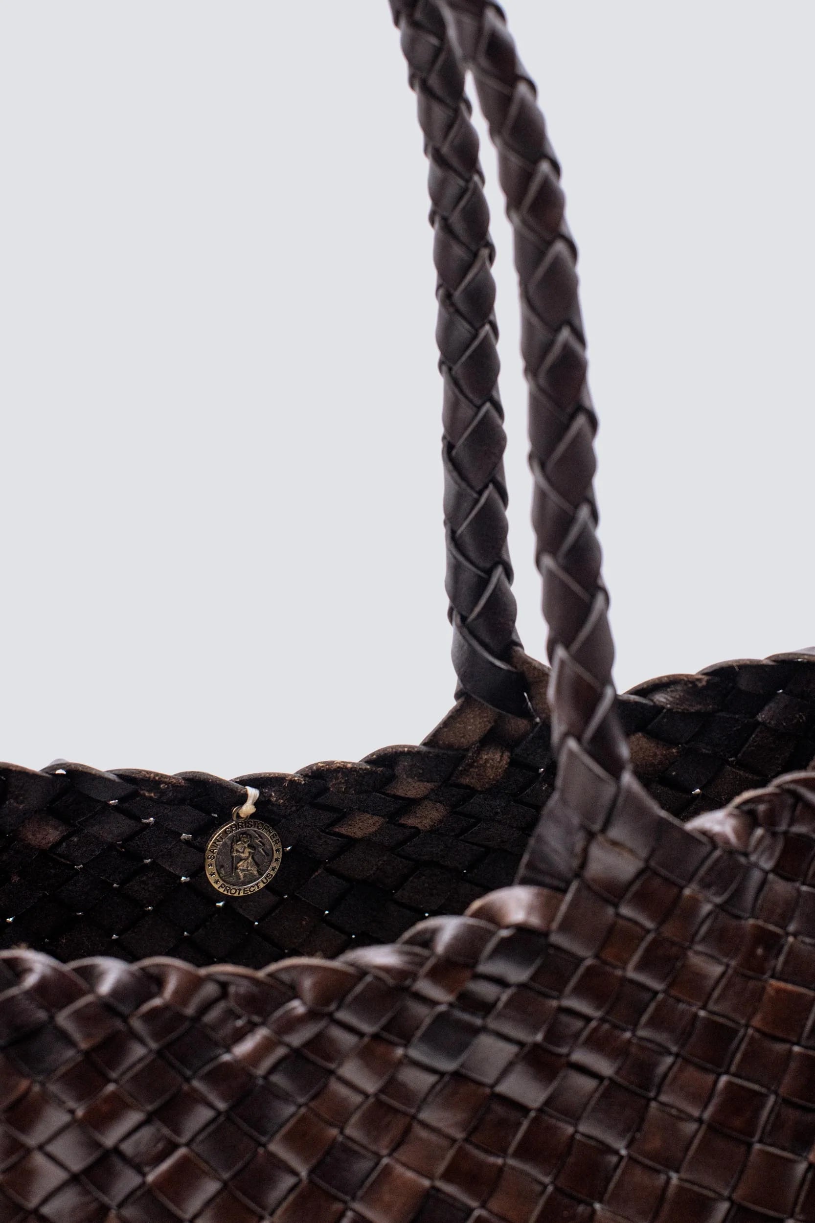 Dragon Diffusion's bags are inspired by traditional woven baskets used for hundreds of years around the world. This 'Santa Croce Big' tote is made from vegetable-dyed strips of leather that get thinner towards the top to achieve the elegantly curved trapeze shape. Inside you'll find a hand-sewn St. Christopher medal charm, believed to manifest protection on your travels and the brand's marker of quality and authenticity.
