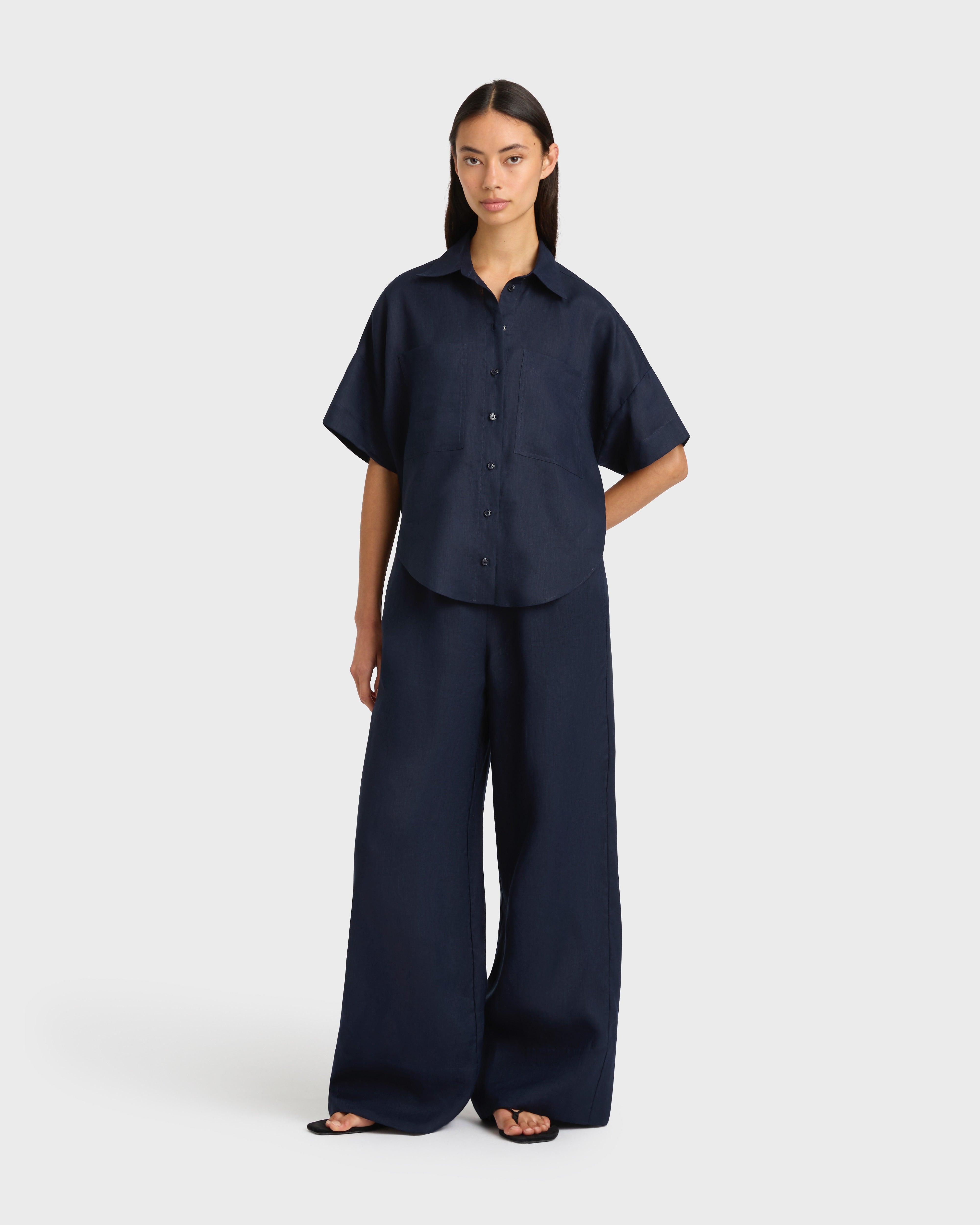 Wide-leg pant crafted from structured linen, designed with an extra-wide elasticated waistband for comfort and ease. Features a full-length leg with a deep hem cuff and functional side seam pockets. A versatile wardrobe staple that balances structure with relaxed styling.