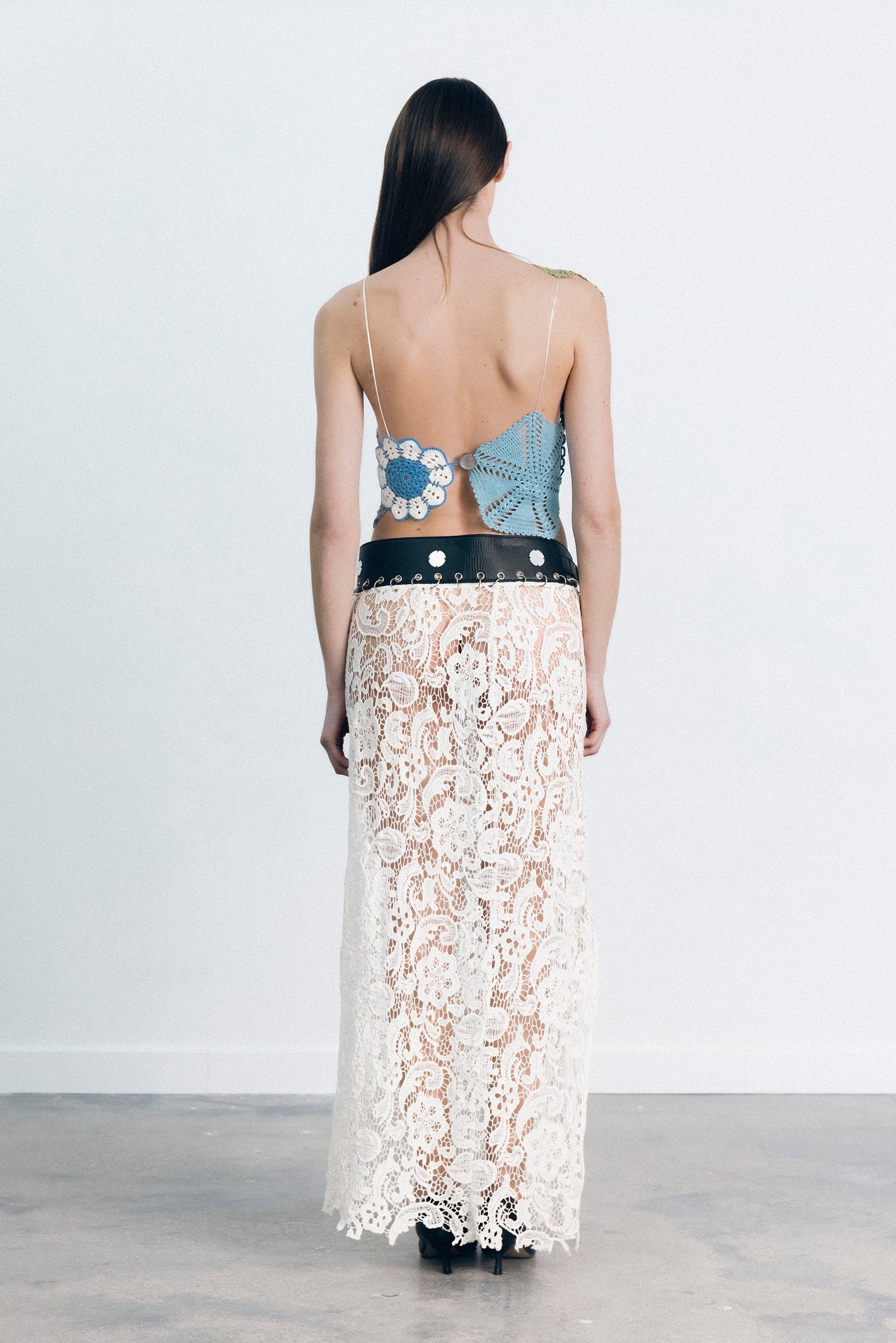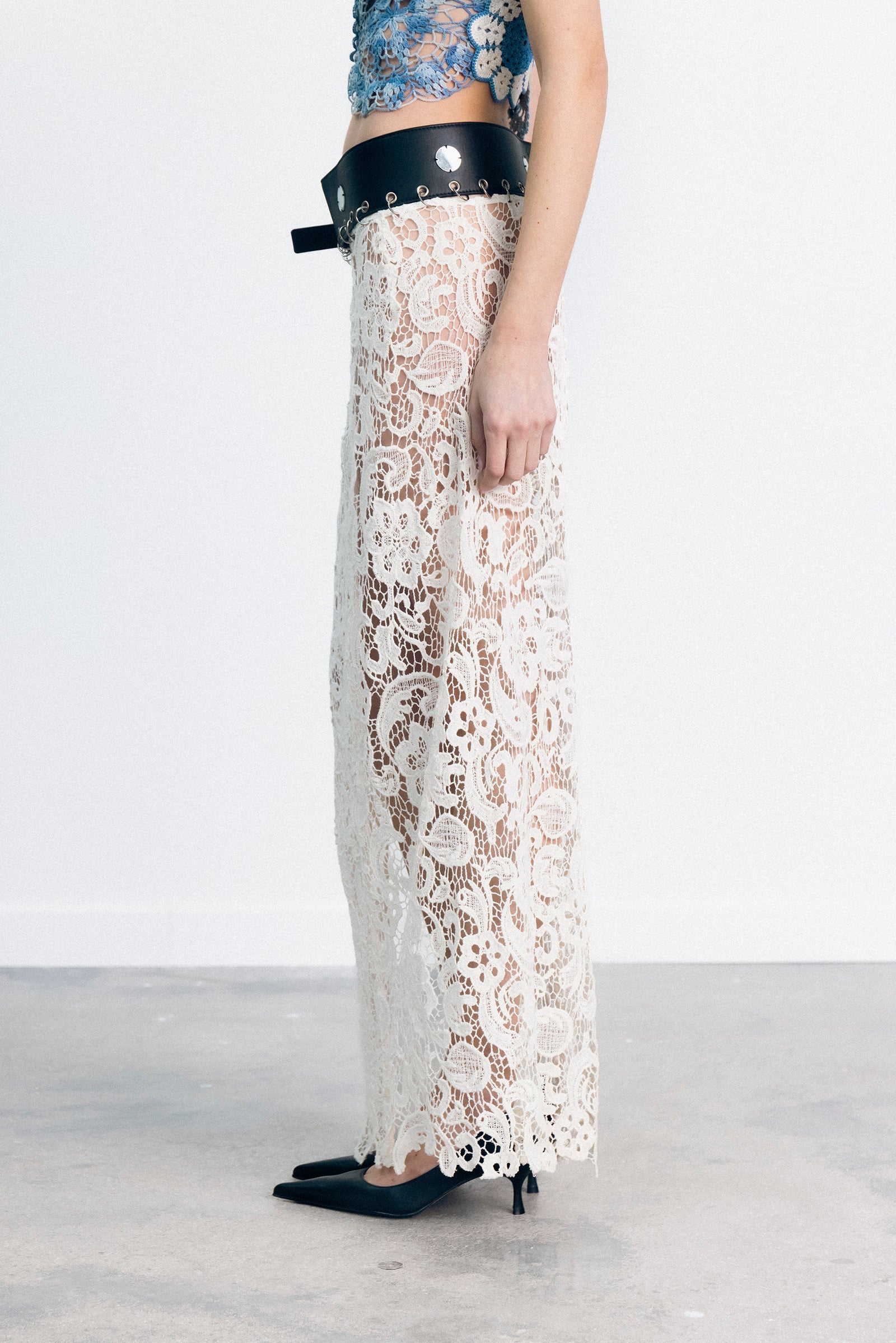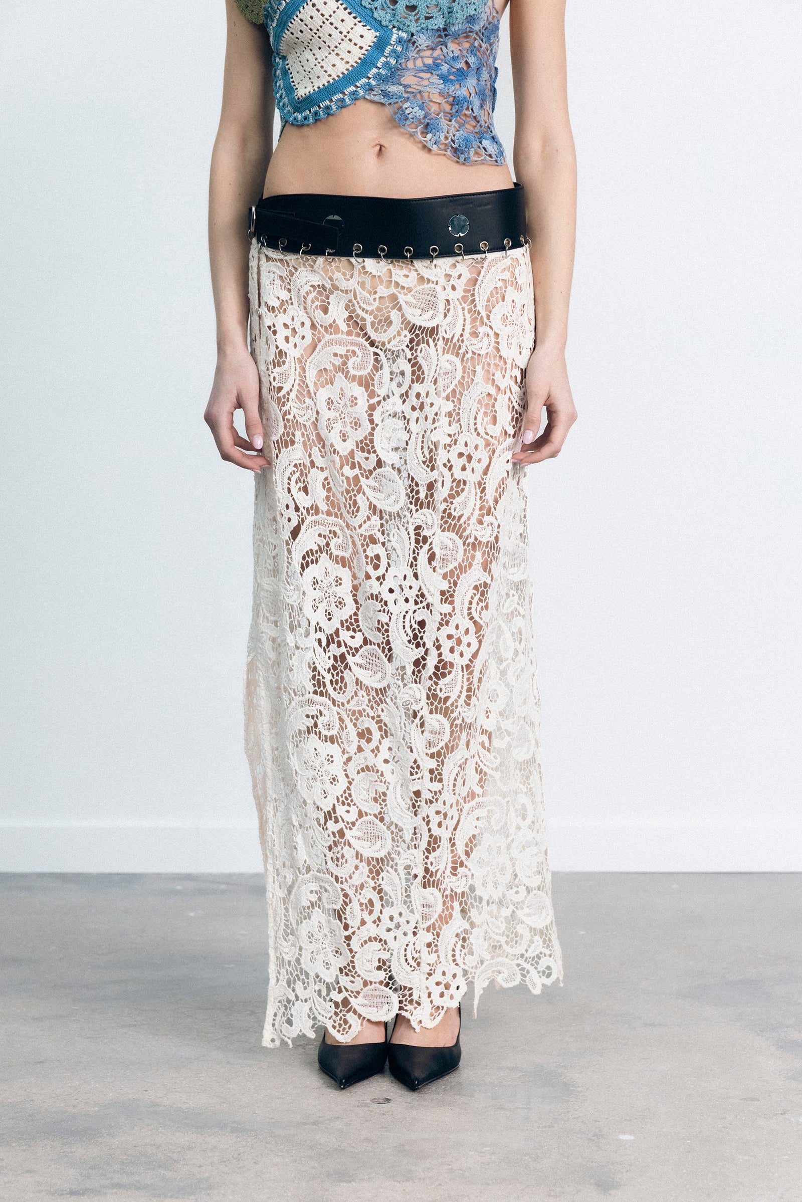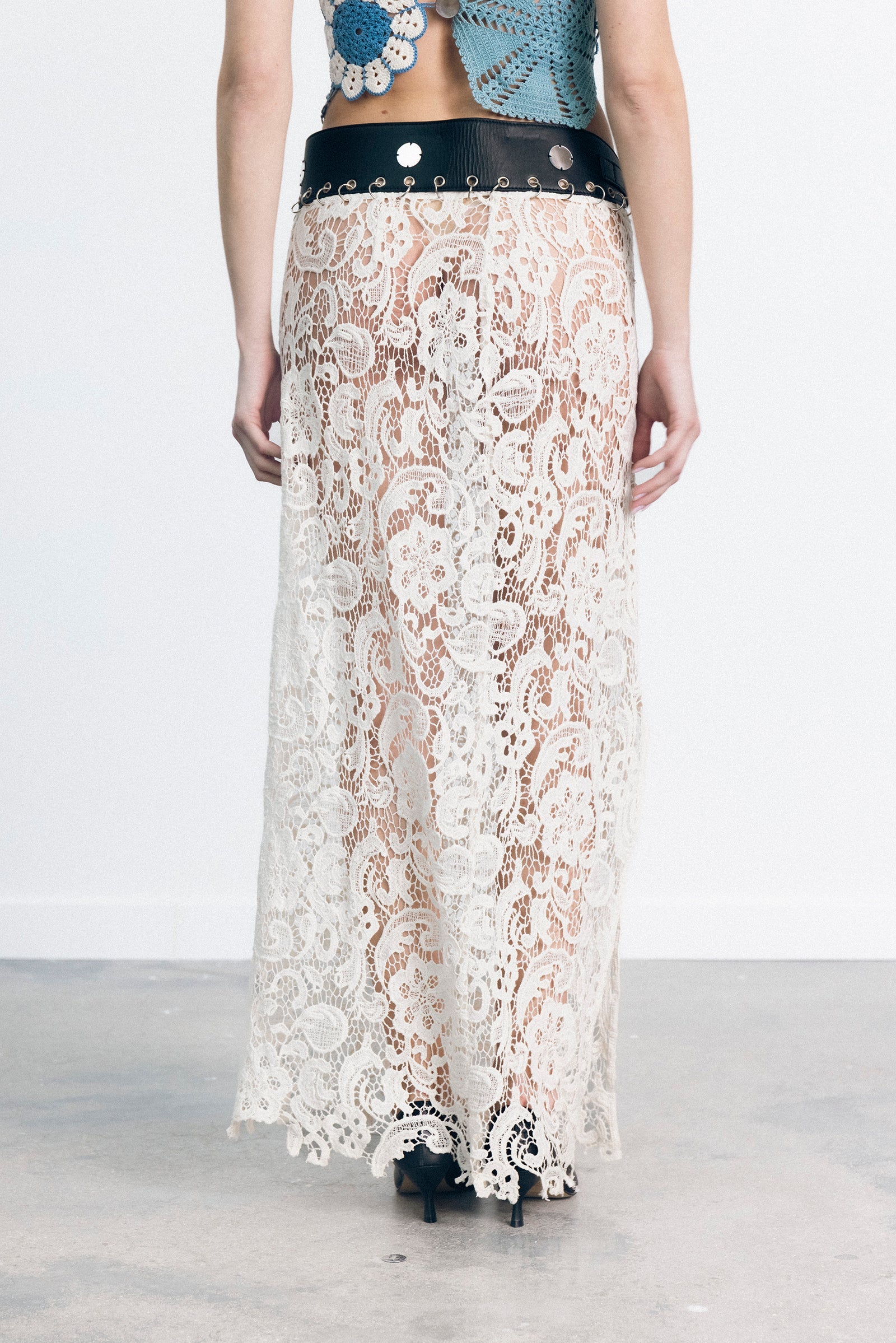 This skirt belt is made from 100% leather and cotton lace in India.