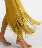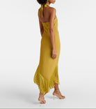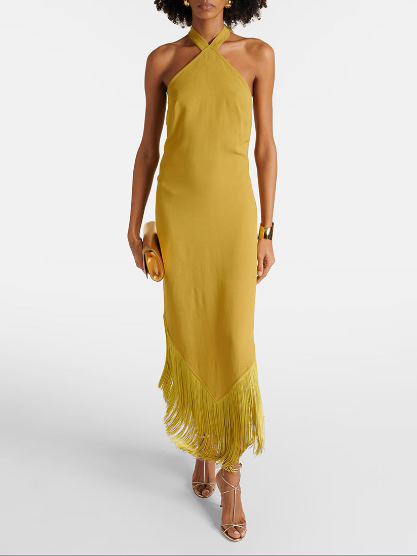 The Nina dress is an effortlessly feminine offering from Taller Marmo. Crafted in Italy by the label's talented artisans, this occasion-ready style is detailed with a shoulder-baring halter neckline and an angled hem that is trimmed with swishy fringing