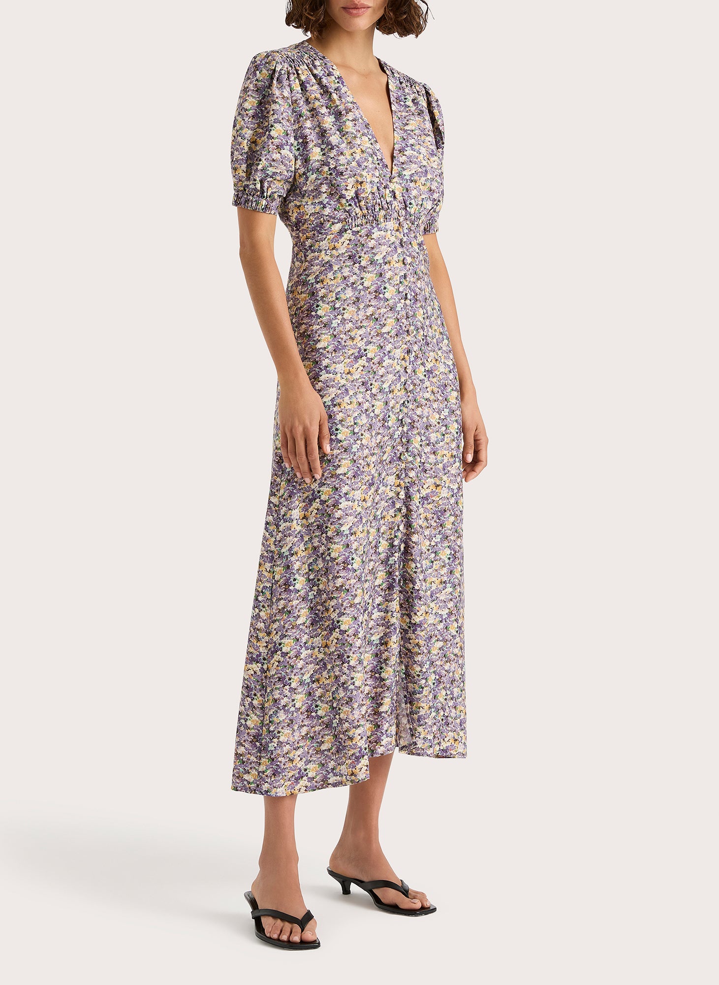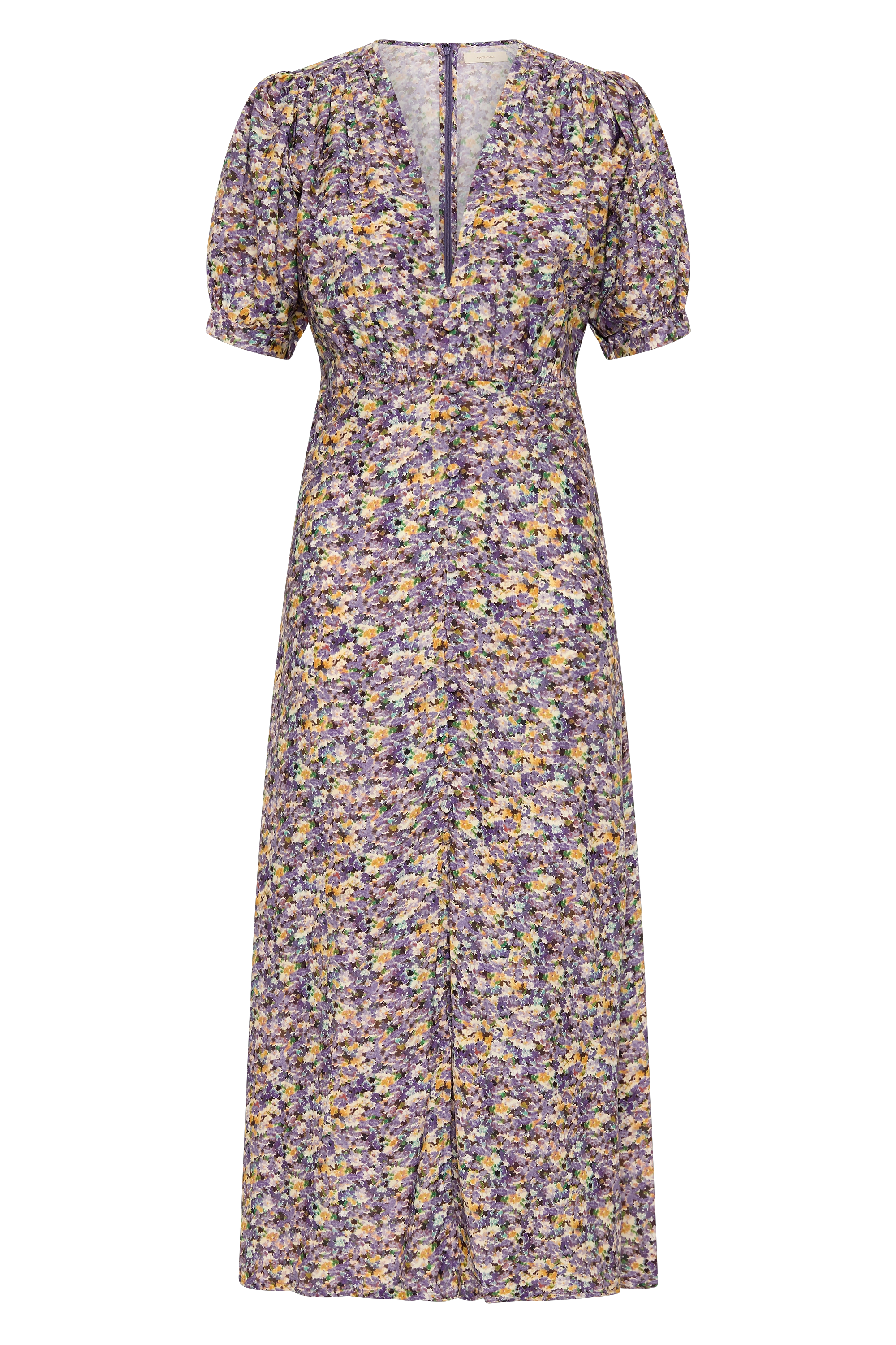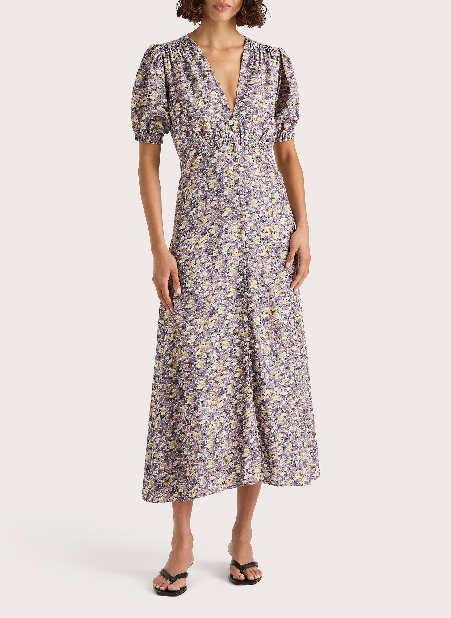 A beloved FAITHFULL silhouette, designed from a soft rayon fabrication. It features a low V-neckline with soft, rounded sleeves, elasticated at the cuff. There is subtle gathering at the bust for a feminine touch and button detailing down the front, allowing for a front skirt split if desired. From the waist it falls into a romantic A-line skirt that crops above the ankles. There is additional elastic woven through the waist, under the bust and along the shoulders for a more comfortable fit as well as a back waist tie detail. Offered in a light purple floral, style with a simple sandal and transition from everyday wear to vacation wear with ease.